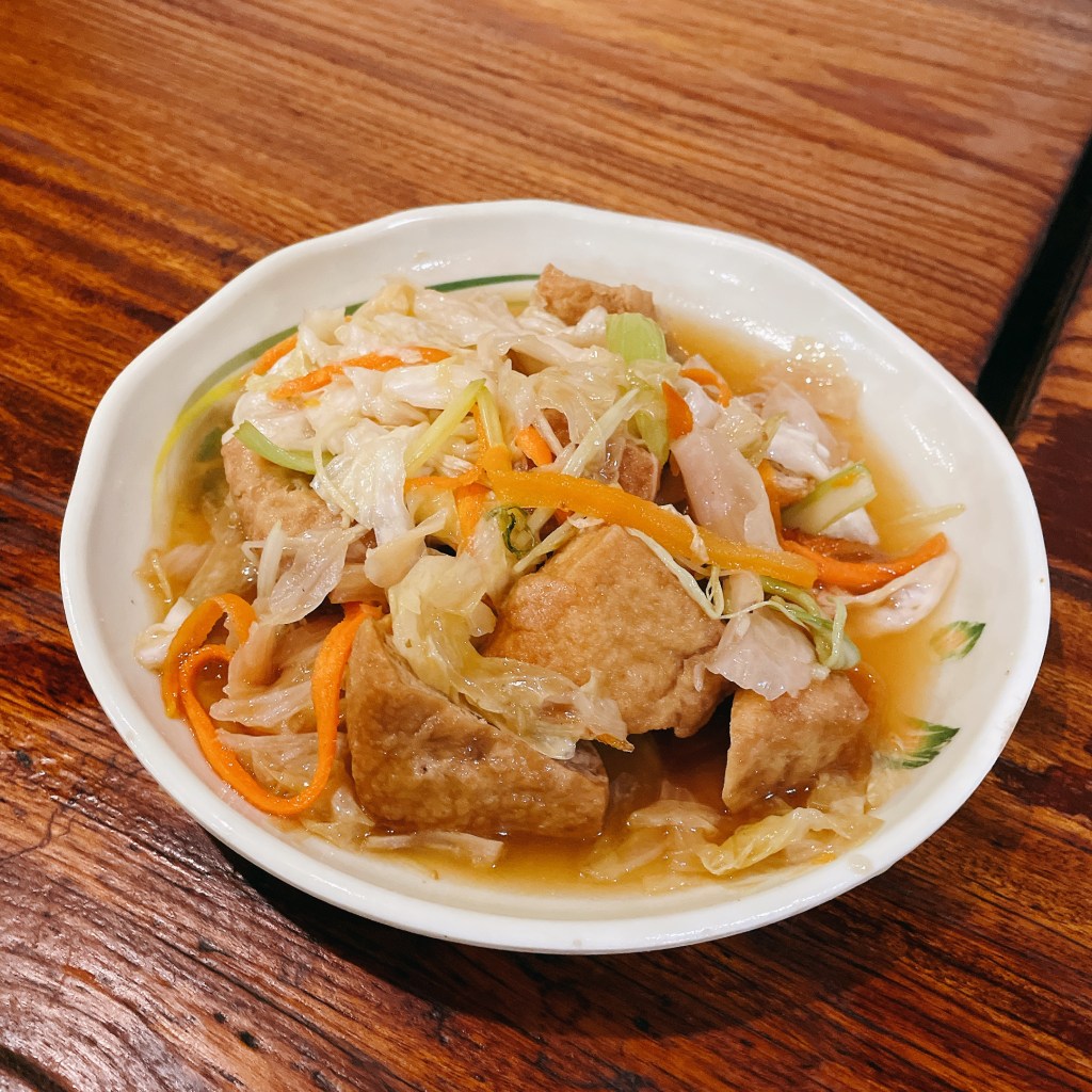 另一道泡菜臭豆腐則是用三角形的臭豆腐與台式泡菜、芹菜與醬汁炒勻,與一般的酥炸臭豆腐或麻辣臭豆腐(湯)截然不同,不會那麼臭、但也好吃。