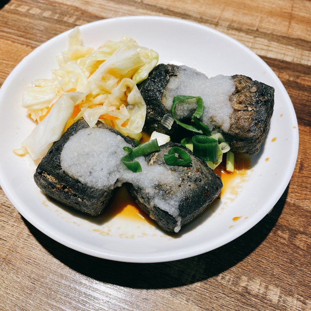 4塊炸到酥脆的『曜石黑』臭豆腐,覆蓋厚厚一層雪白蒜泥,醬油和清淡的台式泡菜很對味,是店內最好吃的點心,喜歡吃辣的人記得加點生辣椒醬更美味喔!