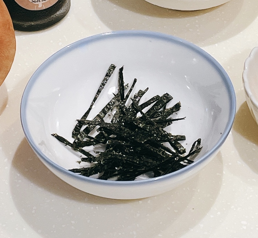 將原味海苔(1大張)對折兩次、再用食物剪刀剪成細絲備用