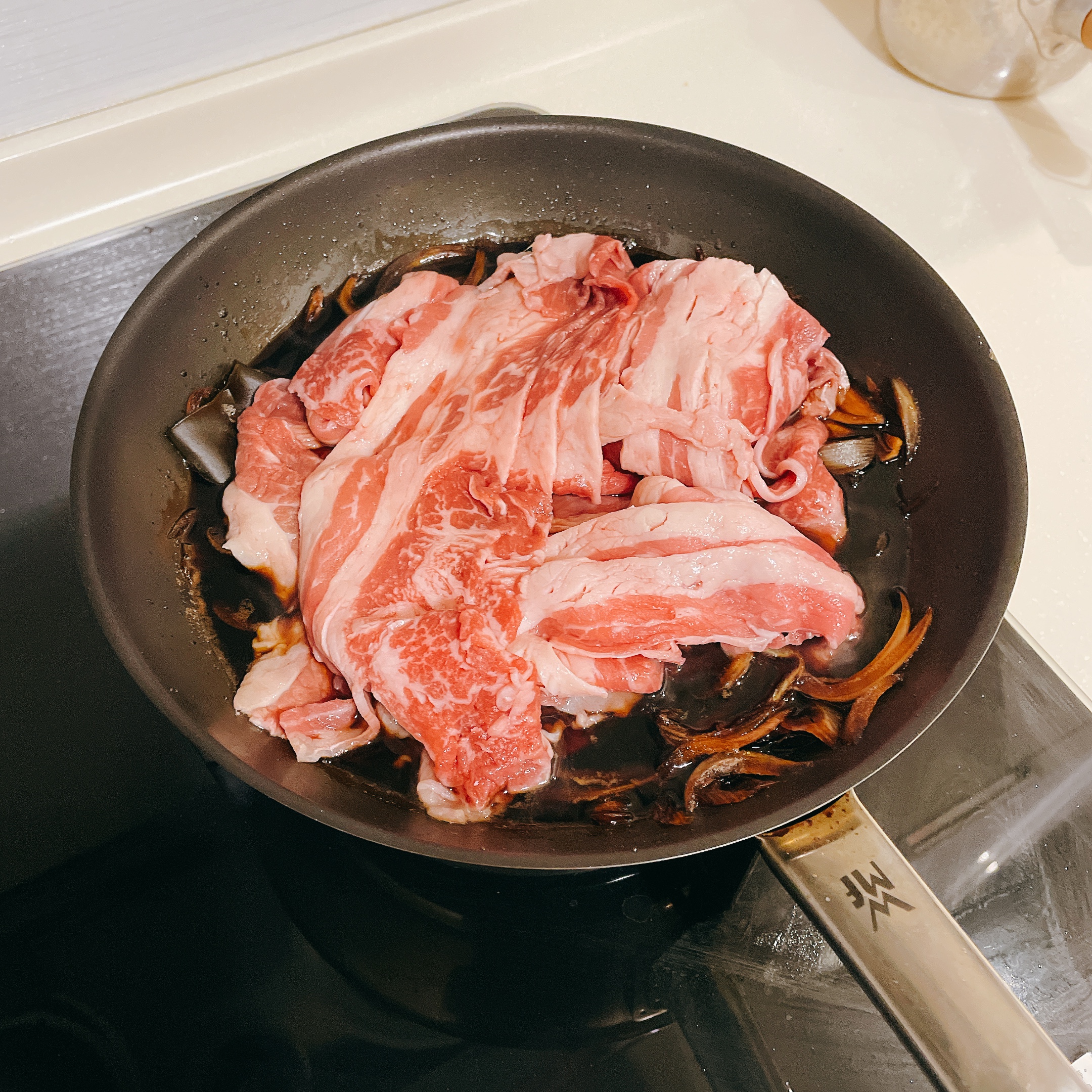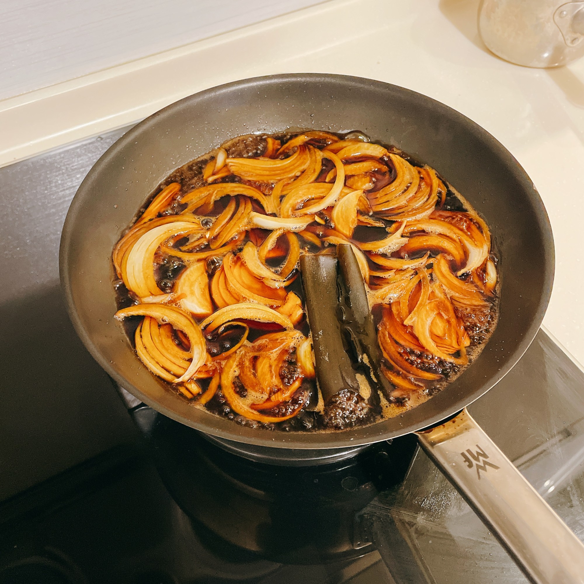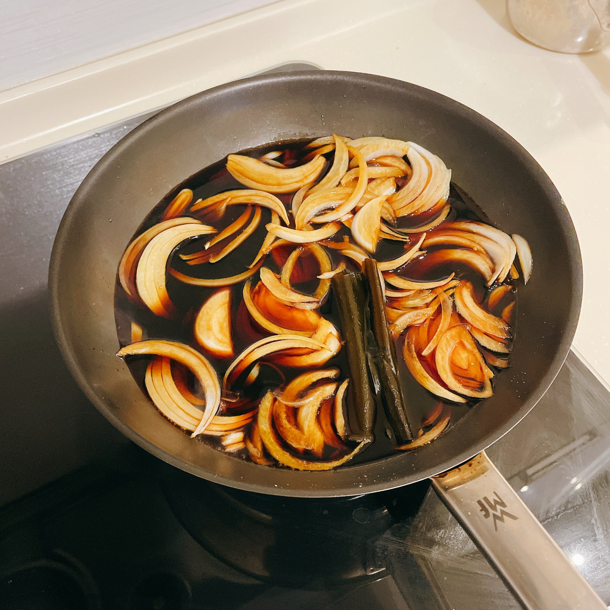 將事先煮好的壽喜燒醬汁(265ml)和昆布再次煮沸,加入切成細絲的洋蔥(1顆),以中火煮到洋蔥軟化呈現半透明色澤,