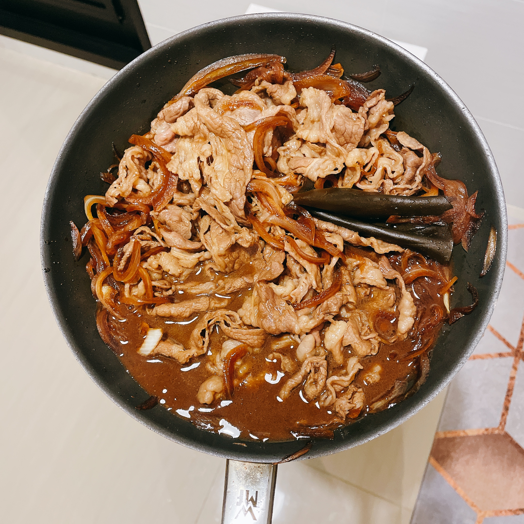 米飛最喜歡使用Costco販售的牛胸腹肉肉片做丼飯;只要事先備妥壽喜燒醬汁,不需高湯也能快速變出媲美丼飯專門店的月見牛丼喔!