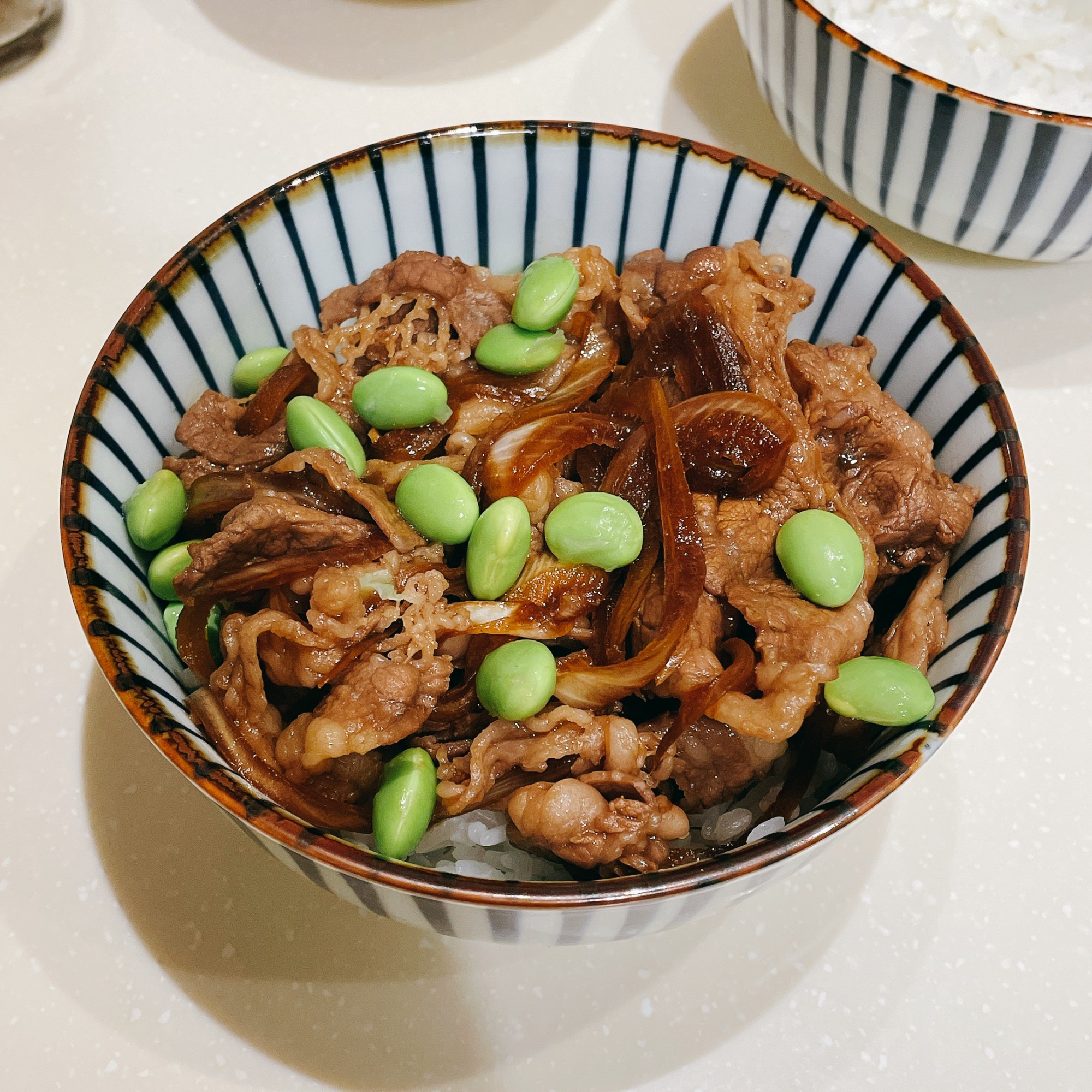 一般牛丼大多以青蔥配色,但米飛不太喜歡,因此改以毛豆取代青蔥,吃起來絲毫不輸青蔥版本喔!