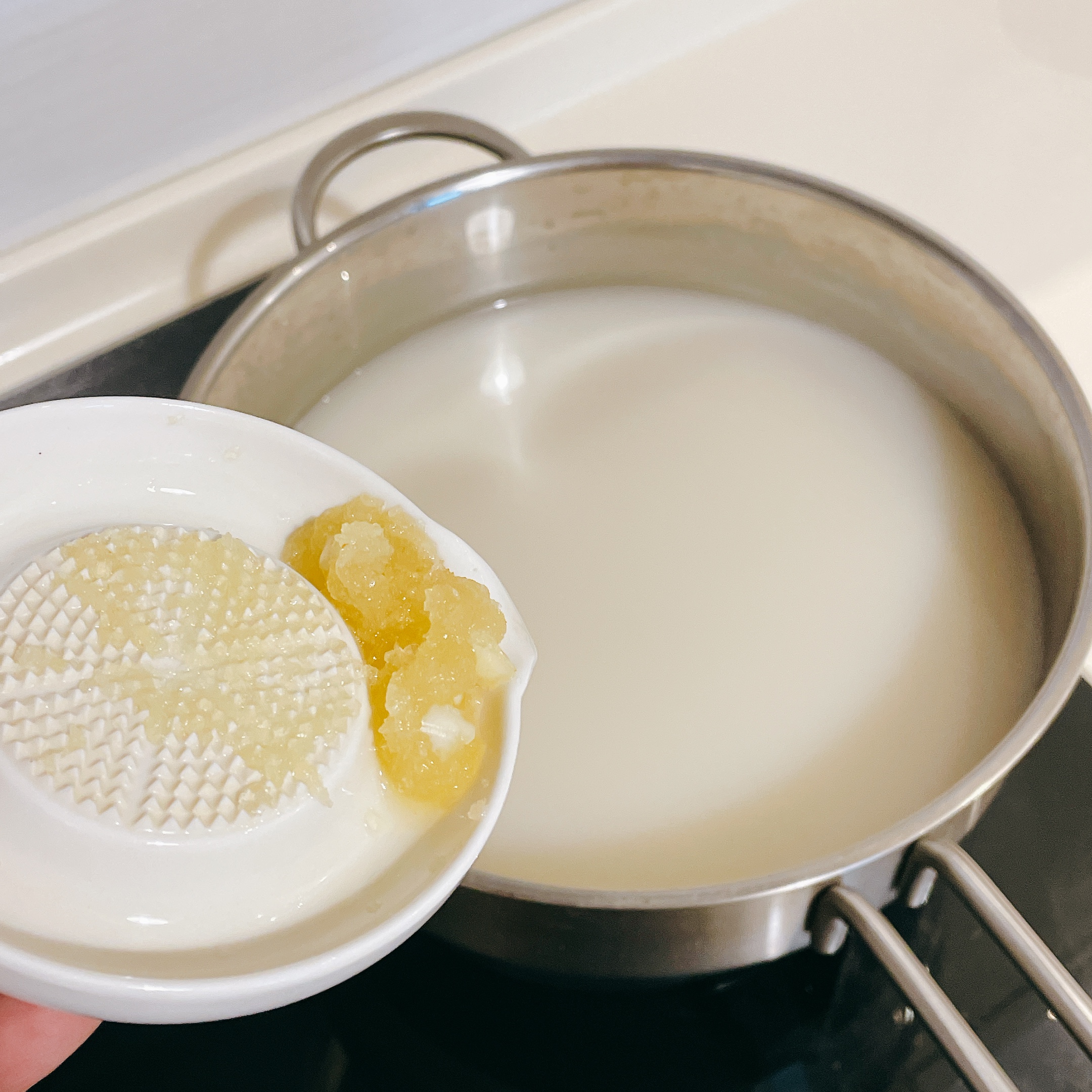 倒入牛骨高湯(490ml)、水(500ml)煮沸,再加入磨成泥的蒜頭(3瓣)、醬油(1大匙)、鹽(1/2茶匙)調味