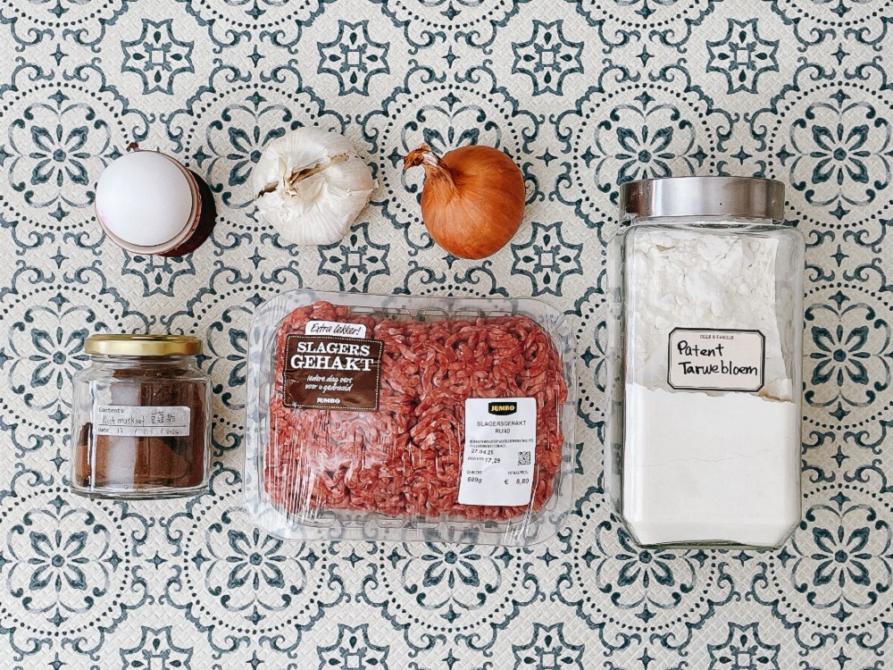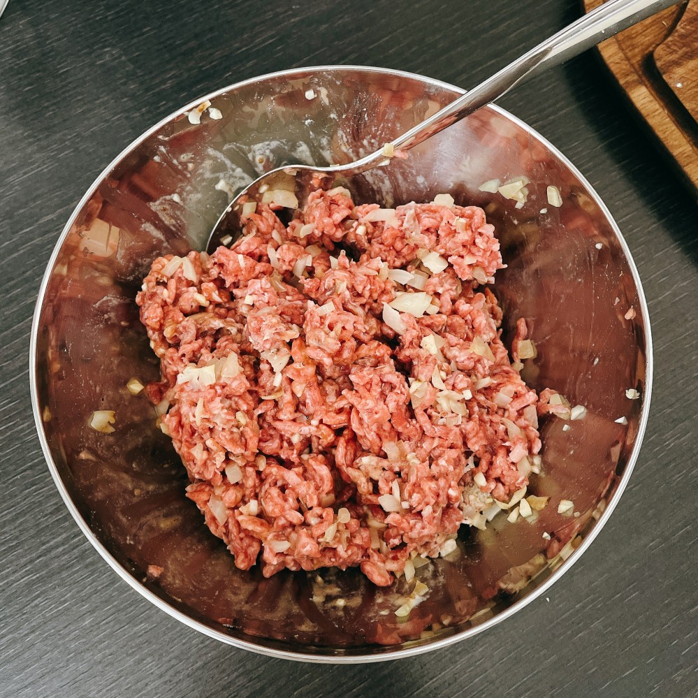料理盆內加入牛絞肉(500g)、雞蛋(1顆)、蒜末(3顆)、豆蔻粉(1/4茶匙)、中筋麵粉(1茶匙)和放涼的炒洋蔥碎(100g),用木湯匙攪拌均勻,再使用雙手按摩絞肉混合物3分鐘(或絞肉產生黏性)