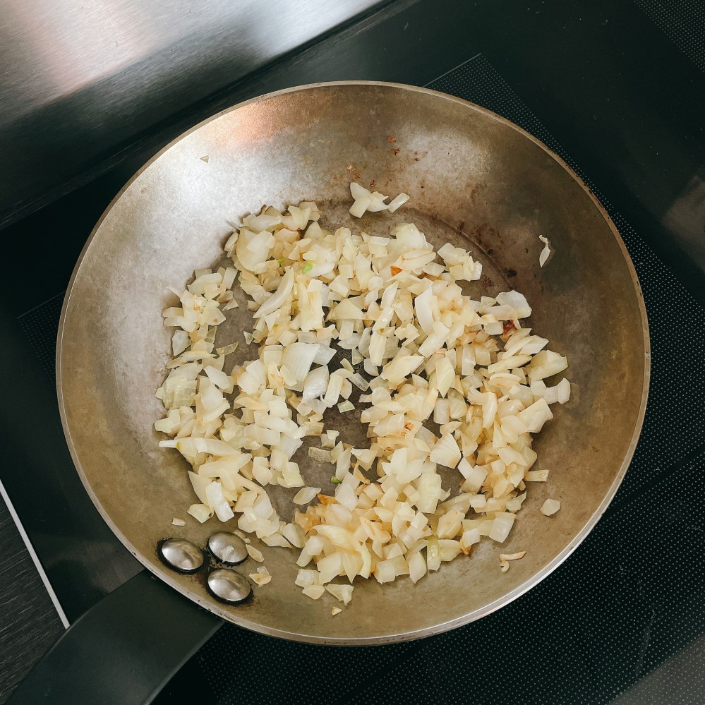 洋蔥(100g)切成碎末,平底鍋加一點橄欖油炒到洋蔥呈現半透明,熄火放涼