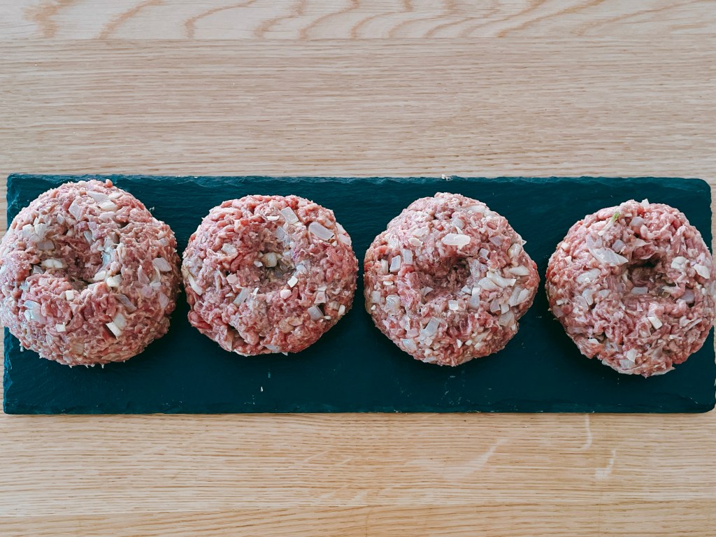用手抓一把絞肉混合物(大約100g),慣用手作為主要施力、將肉球輕輕甩向另一隻手(接住),重複甩拍動作共20次;將完成甩拍的肉球放到肉砧板上、壓扁讓漢堡排約厚度1~1.5cm,最後伸出大拇指在漢堡排中心壓印『按讚』製造凹洞,牛肉漢堡排就準備完畢。