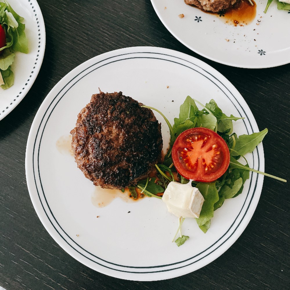 漢堡排我喜歡搭配芝麻葉和布里起司,最後淋一大匙特製醬汁,完成。