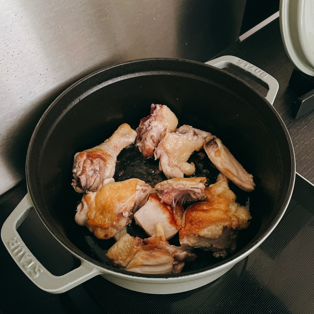 2.半雞切塊後,皮朝下煎到上色並逼出雞油