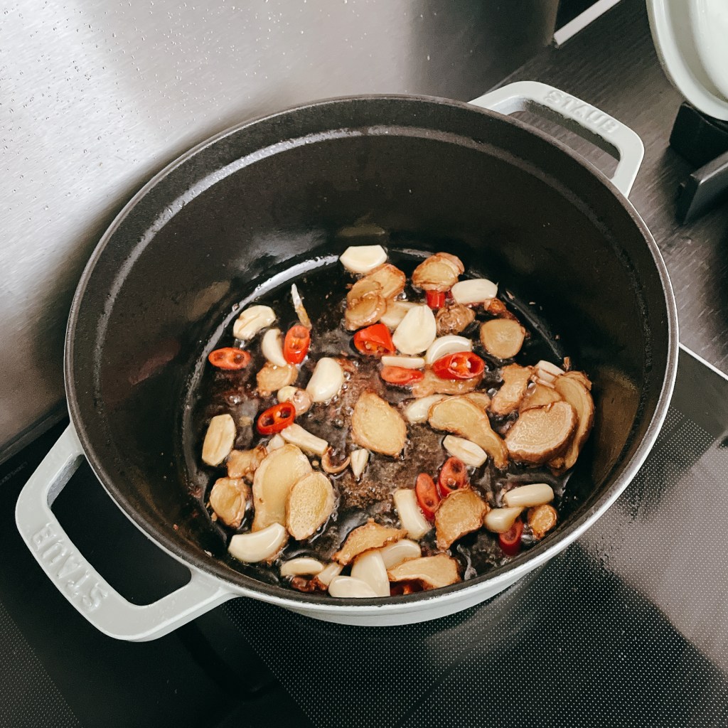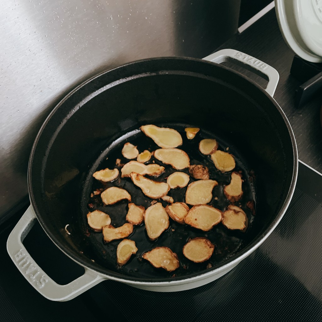 接下來直接在原鑄鐵鍋裡加入薄薑片(20g)利用雞油半煎半炸薑片,直到薑片彎曲炸成金黃色