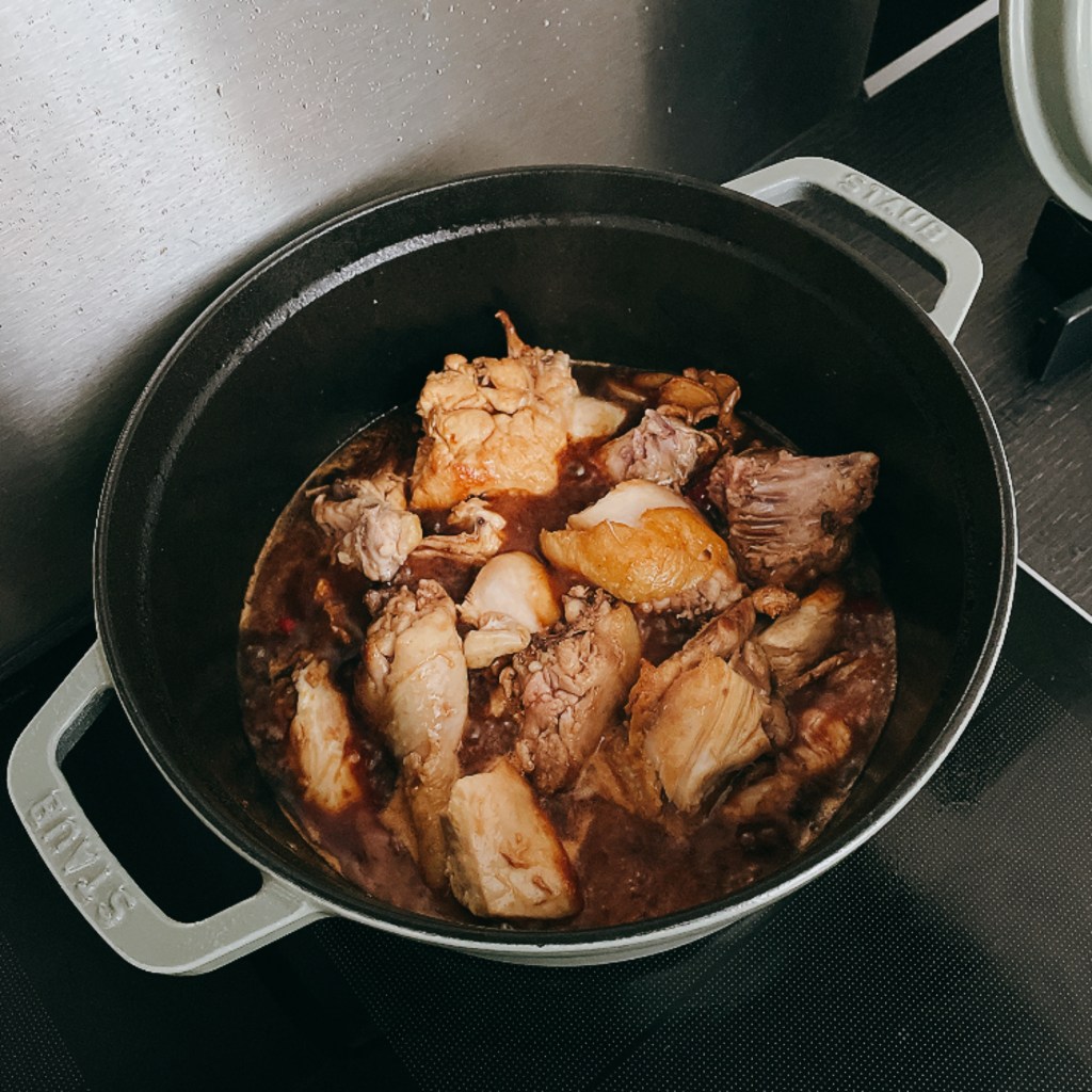 最後把剛剛煎過的雞肉全都加回鑄鐵鍋裡稍微攪拌一下,再加入三杯雞的靈魂調味:醬油(100ml)、米酒(50ml)、水(50ml)煮滾後,再轉成中小火蓋鍋蓋熬煮20分鐘。熄火後,再利用餘熱蓋鍋蓋悶10分鐘。