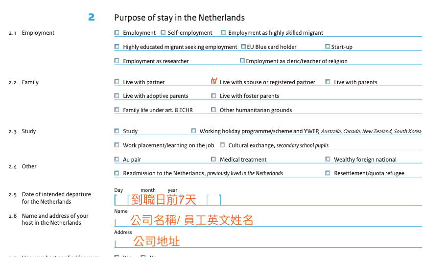 隨著工作者一同前往的配偶,則需在MVV申請書上需勾選「Live with spouse or registered partner 」。