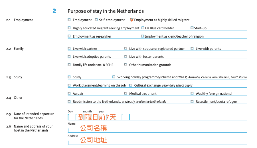 MVV申請書原則上可參照「荷蘭台灣辦事處」官網的填寫範例,ASML人事部還非常貼心提醒需「勾選Employment as highly skilled migrant」並同時提供公司地址供填寫,服務很細膩。