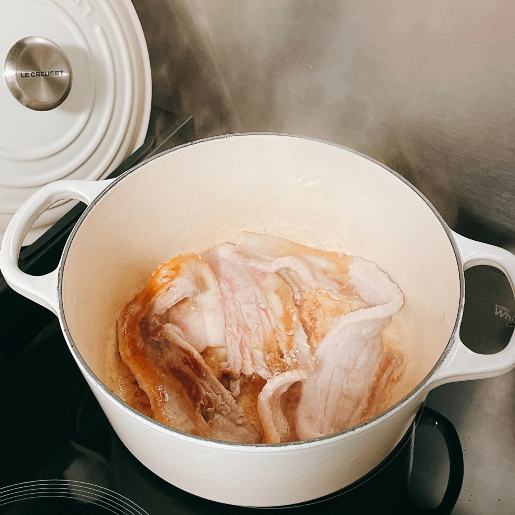 Le Creuset 鑄鐵鍋加熱後,加一點點酪梨油把豬五花肉片(200g)煎到兩面上色,