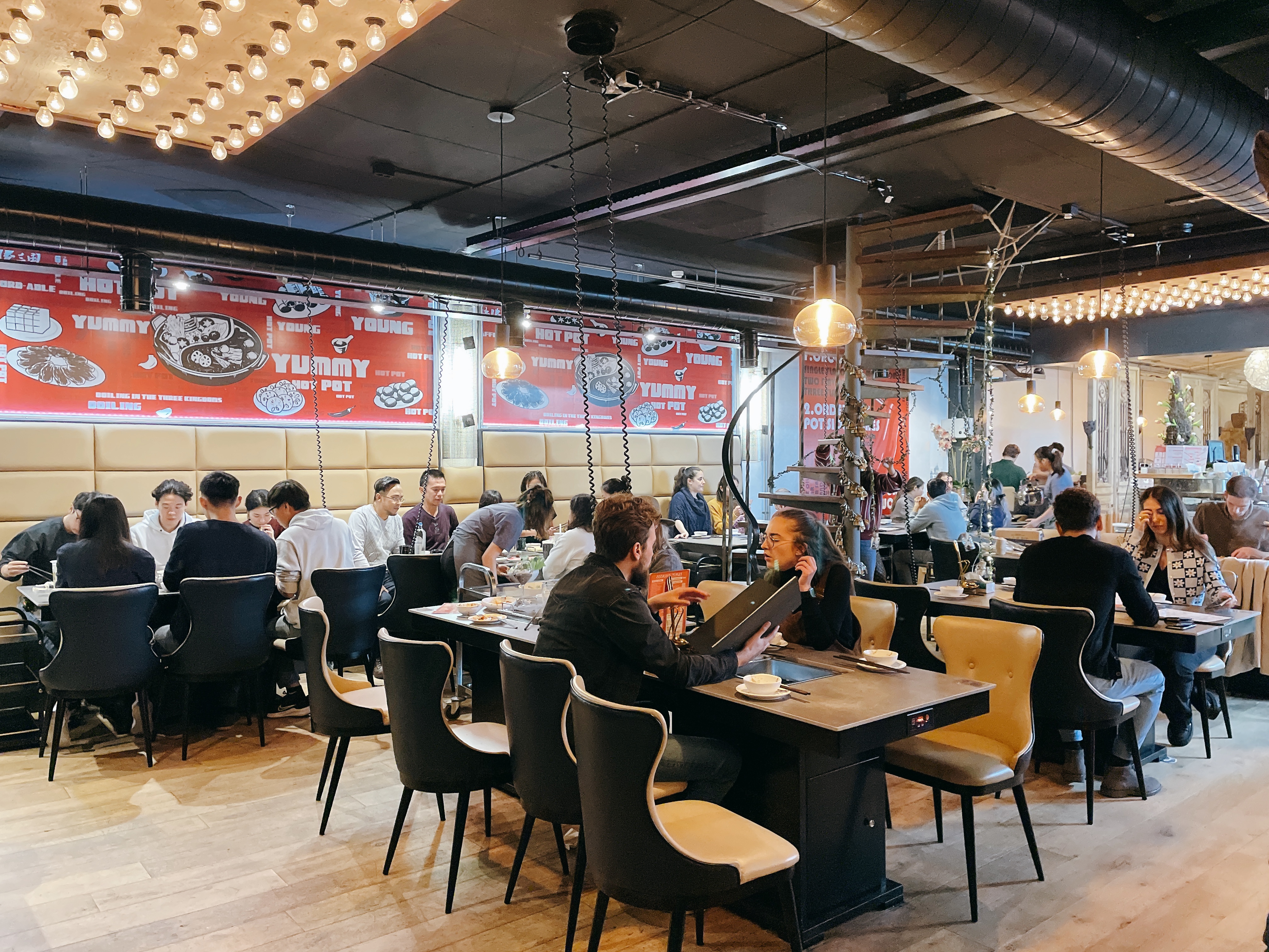 除了普通的桌椅區(左),【沸騰三國】Eindhoven店還設有牛排館會出現的那種浮誇沙發座位(右),