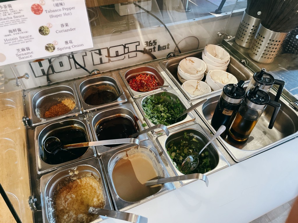 基礎的蒜末/芝麻醬/蔥花/醬油/海鮮醬/香菜/花生粉/沙茶醬/辣椒和醋、香油全都有,但味道稍嫌普通。老實說,我覺得醬料區並非必要,畢竟【沸騰三國】火鍋湯底本身味道很濃郁、就算不沾醬也很好吃。
