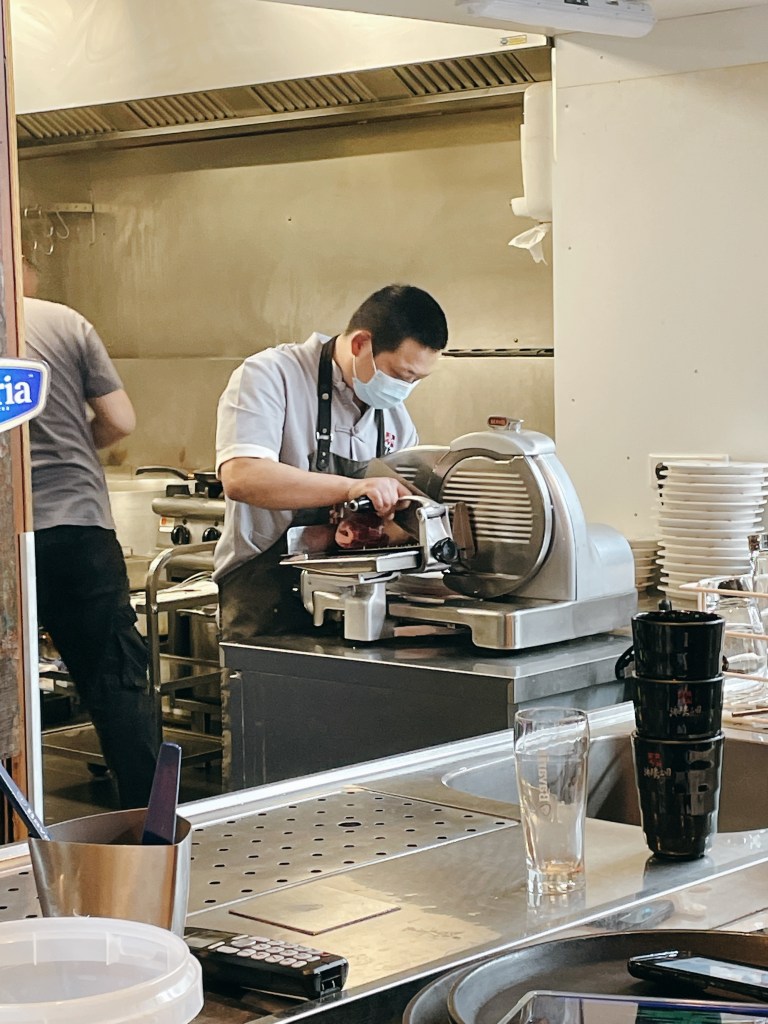 我們用餐當天是星期五晚上,光看片肉駐點人員一直低頭猛切就知道真的是座無虛席,大家都開始進入週末「大口吃肉、大口喝酒」的狂歡模式。