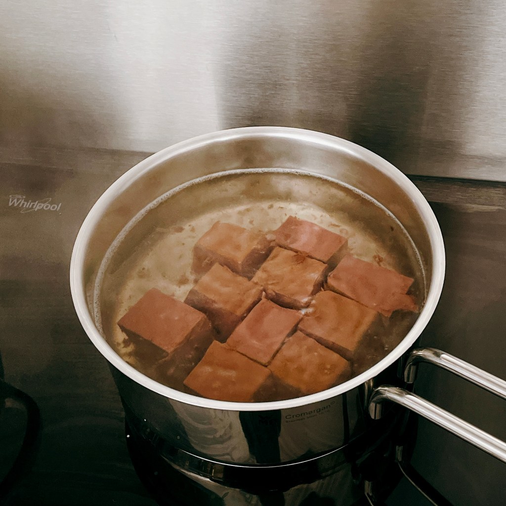 趁滷牛筋的空擋,來處理鴨血。另外準備一個小鍋,把新鮮鴨血(1盒)切小塊,加水(200ml)煮沸滾10分鐘後,