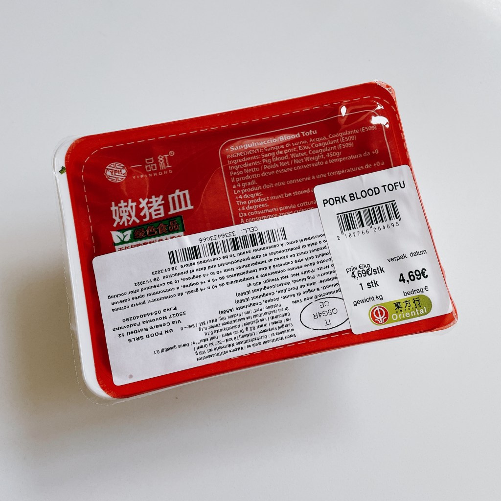若在台灣當然可以直接買老四川賣的滷鴨血料理包;但這次公婆配送的愛心包裹漏買滷鴨血(而且這很重、國際空運成本太高),所以我是去荷蘭亞洲超市「東方行(Amazing Oriental)」買新鮮豬血(pork blood tofu)取代。