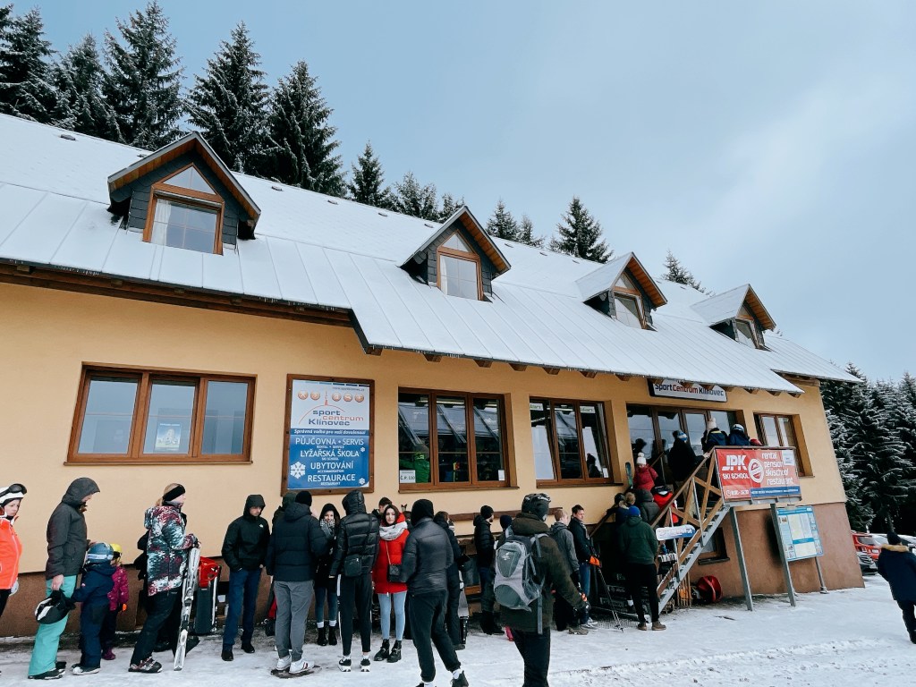 不過,由於我們這次因氣候因素被迫到捷克端雪場(Klínovec),所以直接在雪場廣場前的唯一一家雪具店租雪板/雪靴/雪帽。