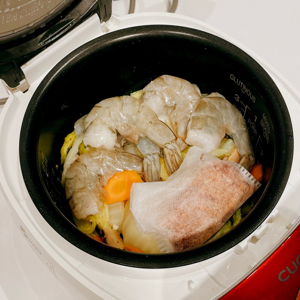 將柴魚片(50g)裝入茶包袋,連同爆香過的大白菜食材、蝦仁(100g)、醬油(3大匙)、淡菜高湯(100ml)、花菇水(100ml)放到CUCKOO電子鍋內鍋裡,