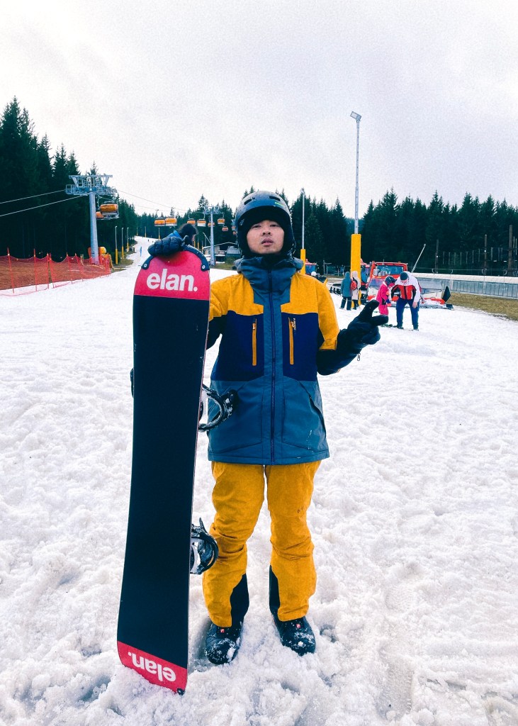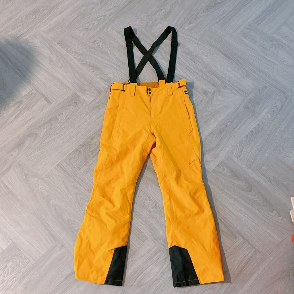 半獸人先生選擇的是PROTEST芥末黃overall(吊帶雪褲)搭配『獵人綠』雪衣,雪衣袖子顏色恰好和芥末黃雪褲呼應,成功自己變身香蕉聖代。身高173公分的他習慣上半身穿寬一點,所以雪衣挑歐規尺寸L、連身雪褲尺寸M,