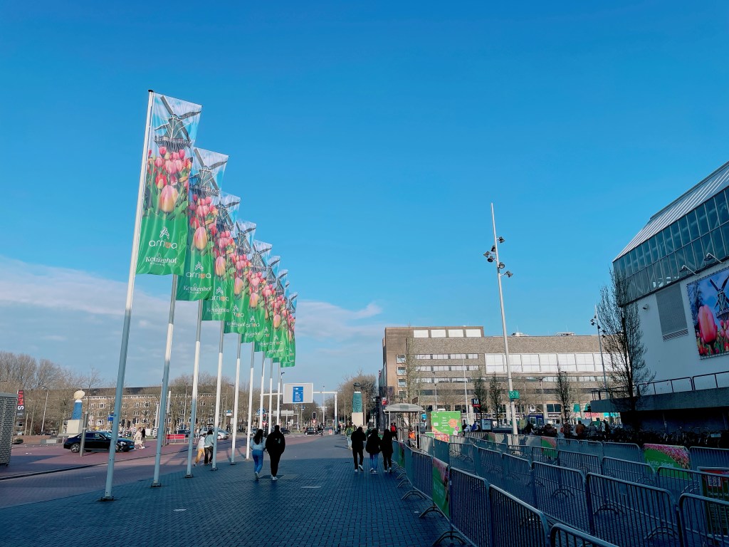 在花季期間,只要走出車站就能看到Keukenhof花園的旗幟和告示牌,跟著旗子(或人潮)就能輕鬆找到搭車地點。