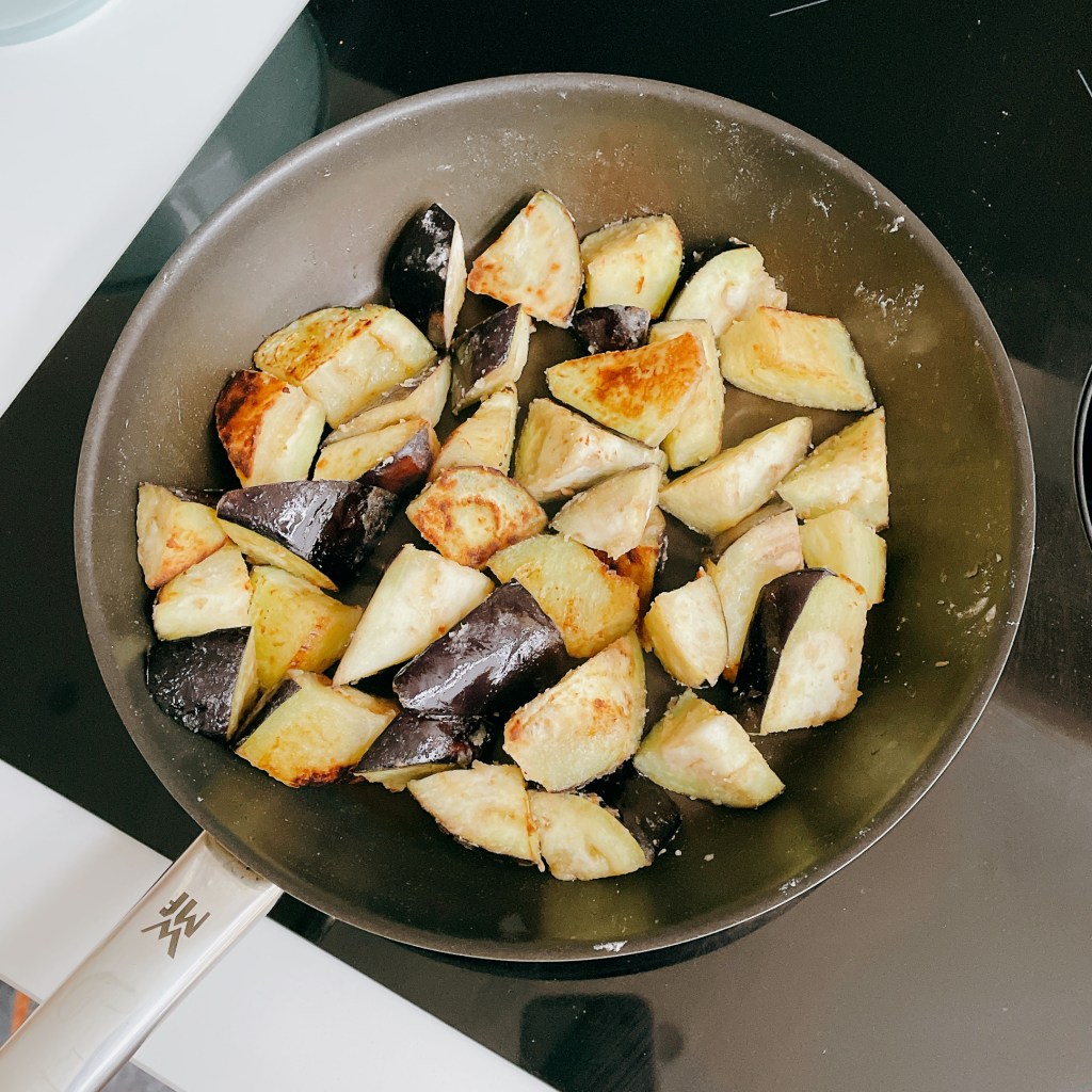 圓茄子(1顆)洗淨滾刀切成小塊後,立刻用麵粉(1大匙)均勻裹覆每一面。接著平底不沾鍋加橄欖油(2大匙)熱鍋後,把裹粉後的茄子每面煎到上色,備用