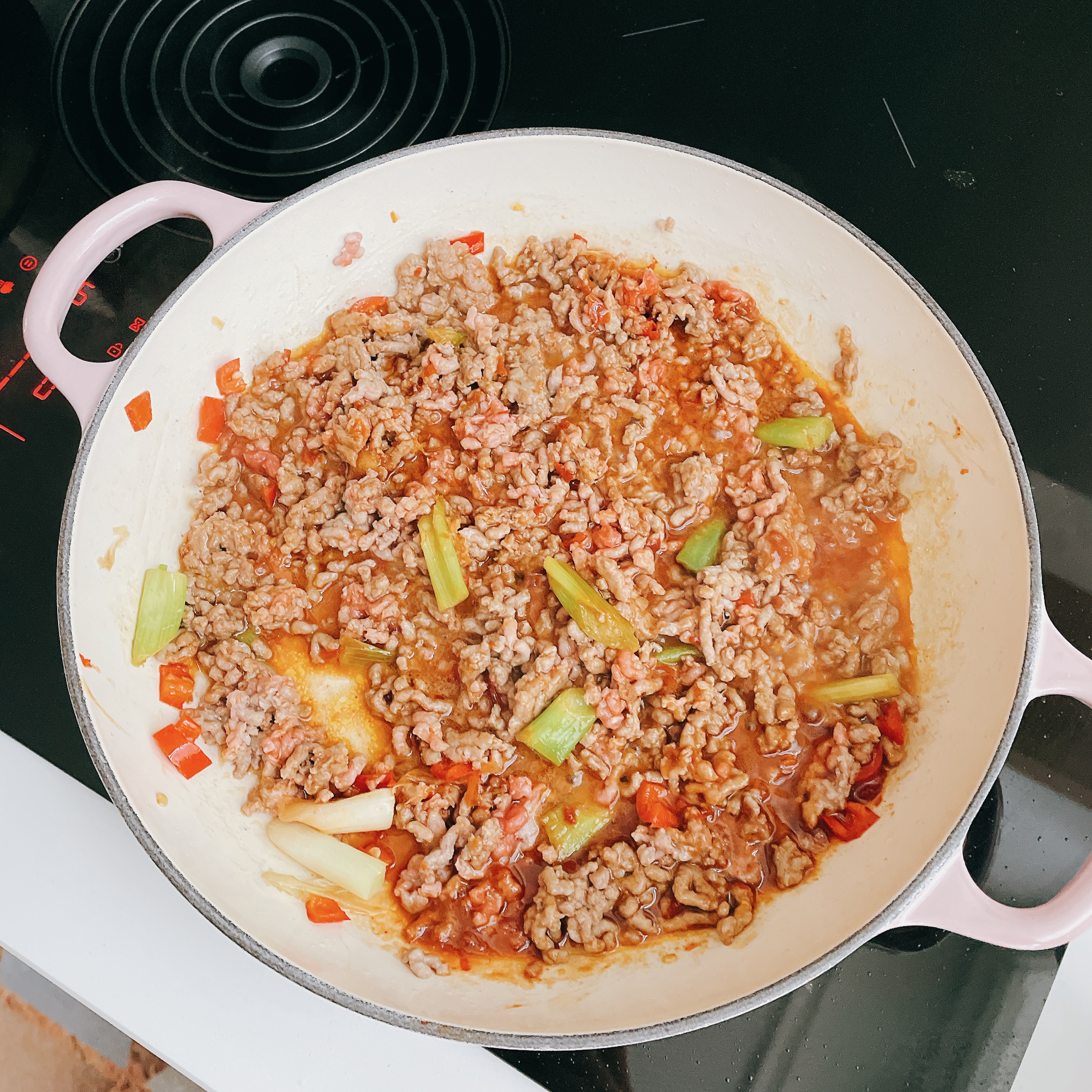 接著於Le Cruset鑄鐵鍋中加橄欖油(適量)和切好的蔥白蔥段(20g)、蒜末(5瓣)、辣椒末(1根)、生薑泥(5g)爆香;再加豬絞肉(500g)、米酒(1大匙)炒到豬肉上色後,加入白味噌(1大匙)、辣豆瓣醬(4茶匙)、砂糖(1大匙)、醬油(4茶匙)拌炒均勻。