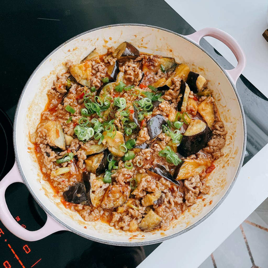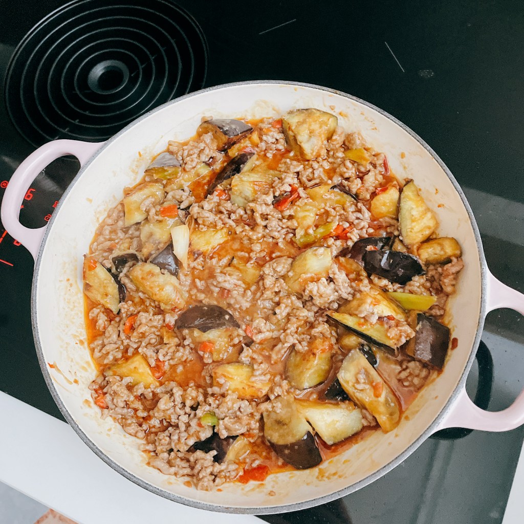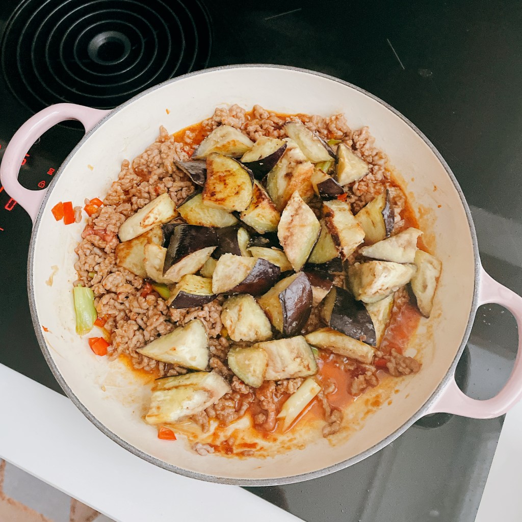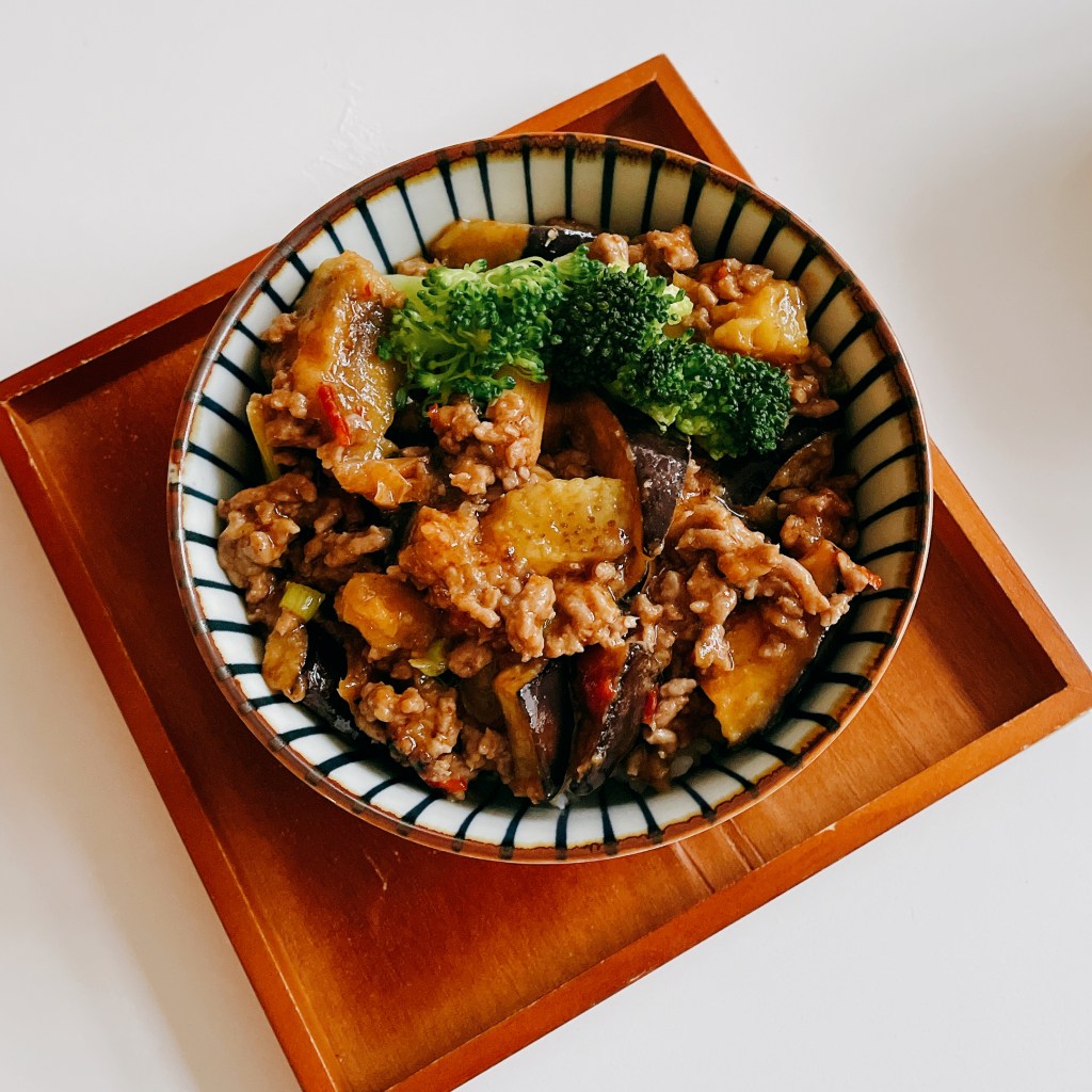 熱到燙舌頭的【麻婆茄子】鋪在剛煮好的白飯上,顧不得燙、迫不及待唏哩呼嚕一勺又一勺送入嘴裡,真的好吃到讓人停不下來!