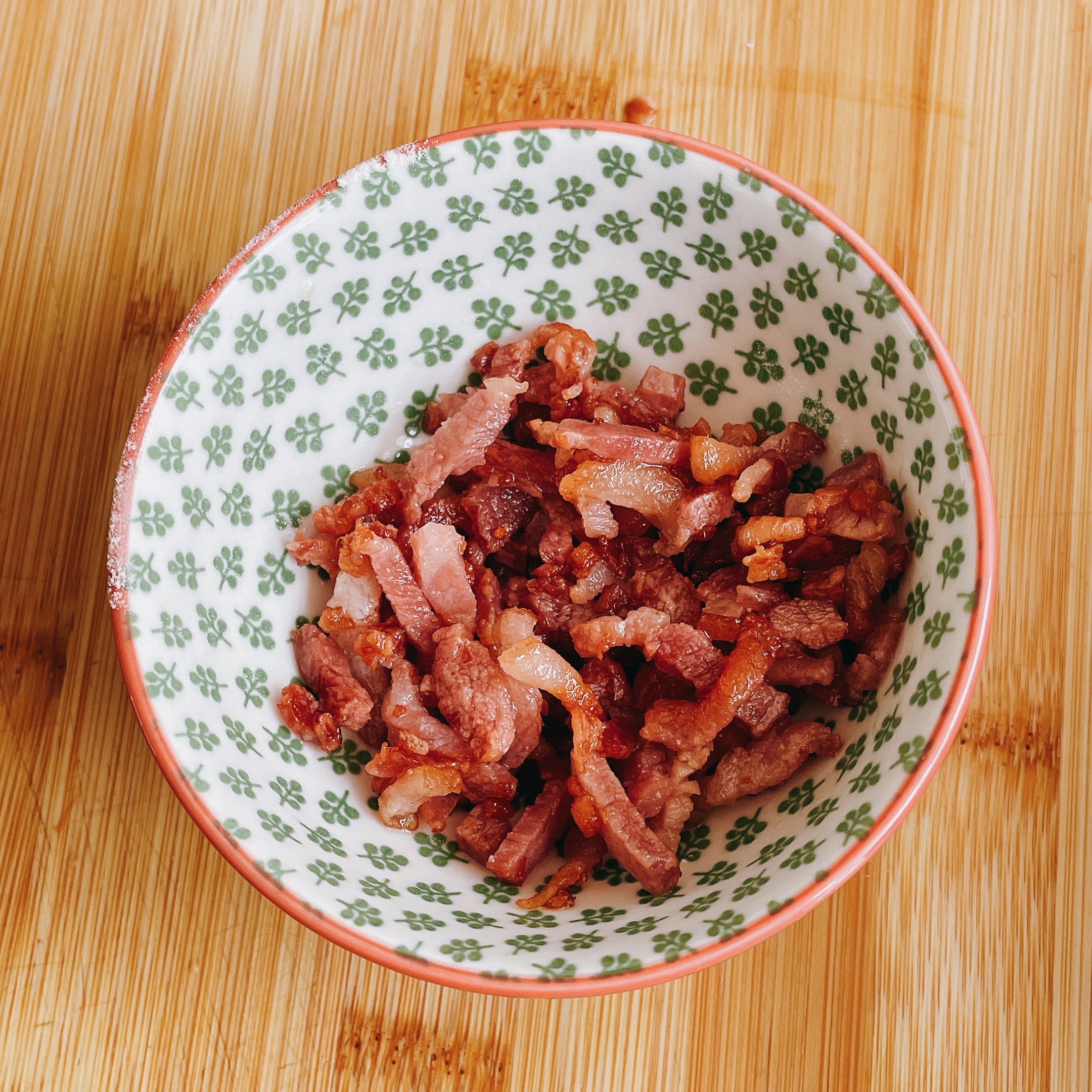 鑄鐵鍋內加適量橄欖油,加入蒜末(5瓣)、培根碎(100g)和紅蔥頭碎末(1顆)爆香,