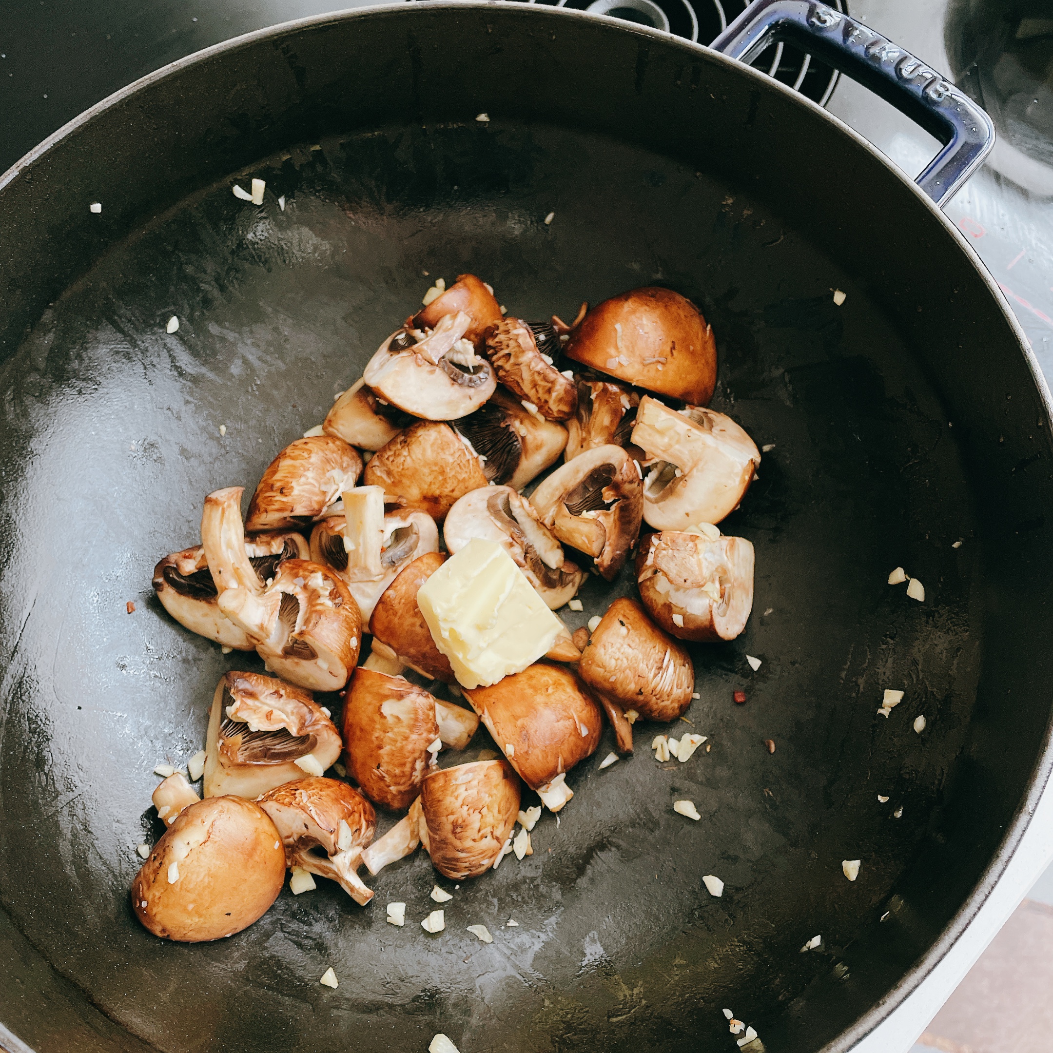 Use bacon grease to sauté mushroom(200g) and minced garlic(3 cloves) to taste, then add unsalted butter(20g) and keep stirring until butter melts. Pour out the mushrooms from STAUB Dutch oven and keep them in a plate.