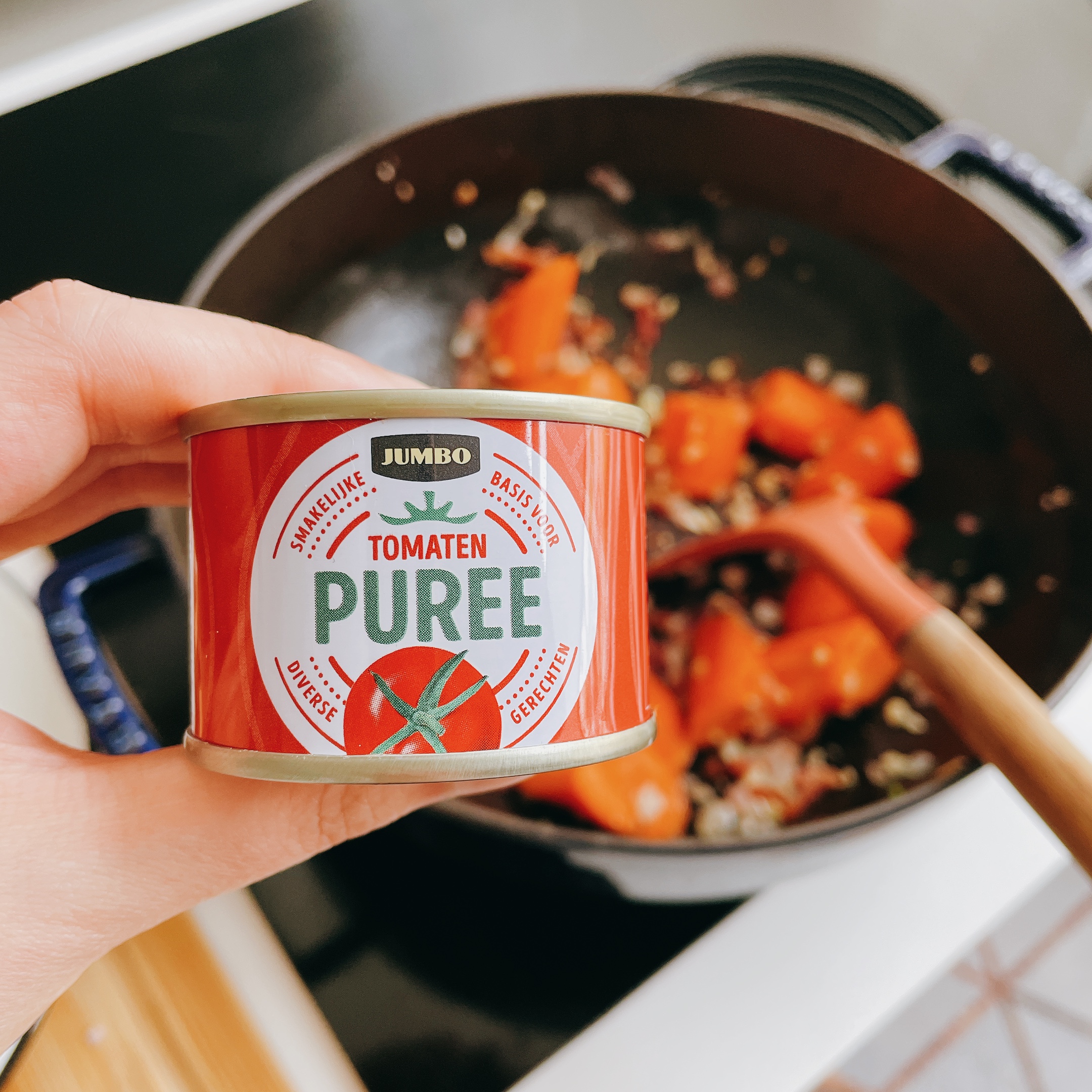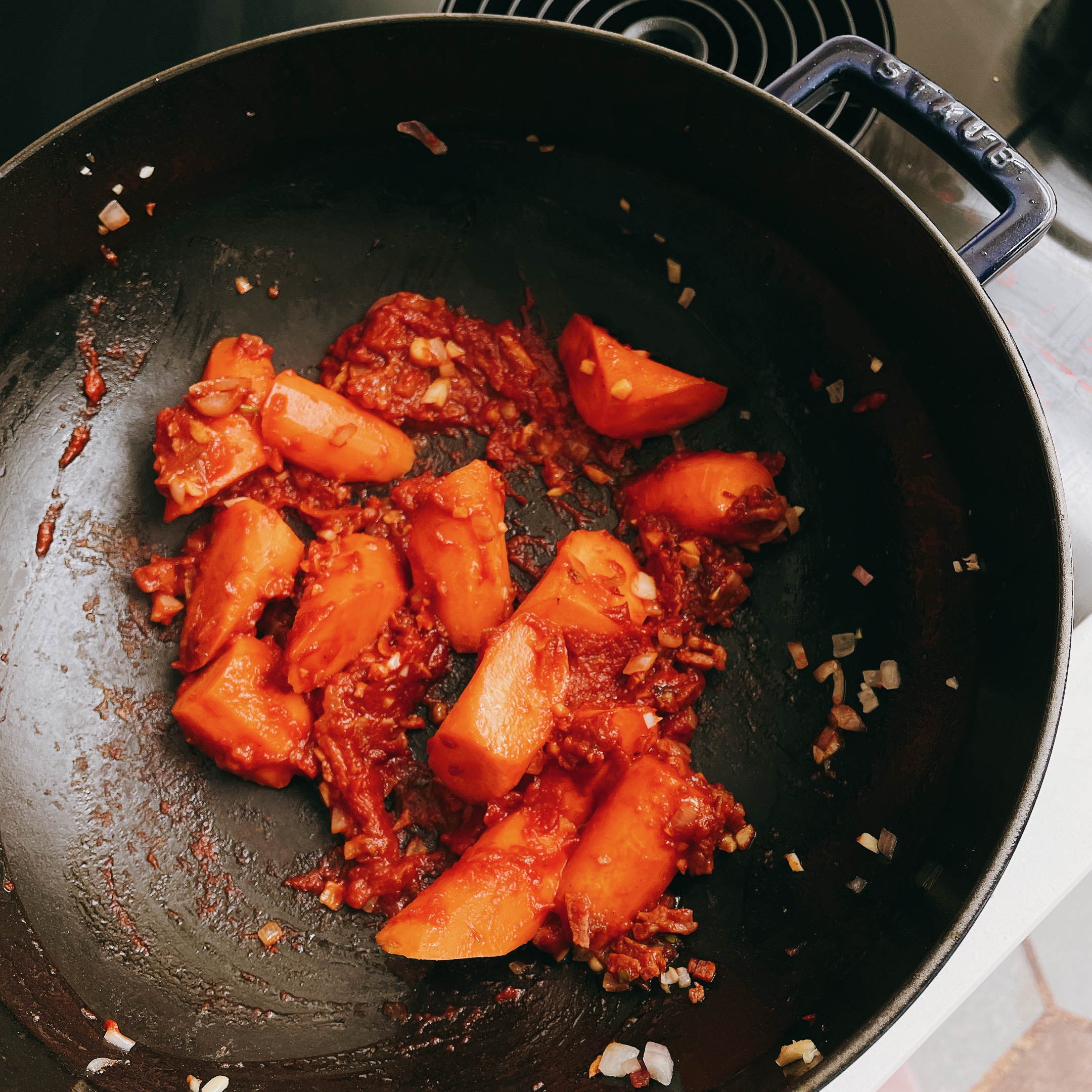 再加入番茄泥(70g)和削皮滾刀切塊的紅蘿蔔(100g)拌炒均勻。