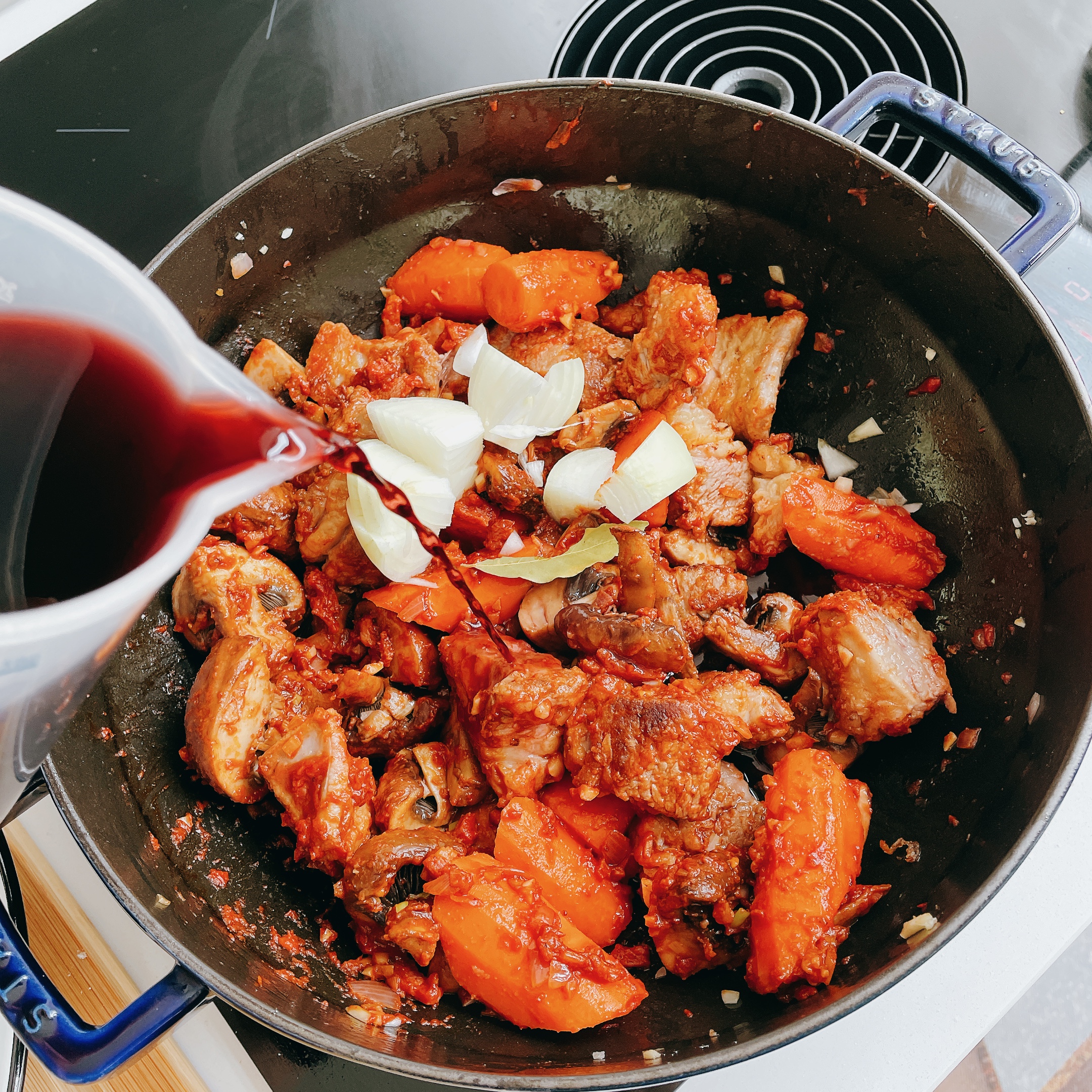 於鑄鐵鍋中加入切成大塊的洋蔥(1顆)、月桂葉(1片)、紅酒(500ml)、蔬菜高湯(300ml)以及剛剛炒好的食材(蘑菇、牛肉塊),