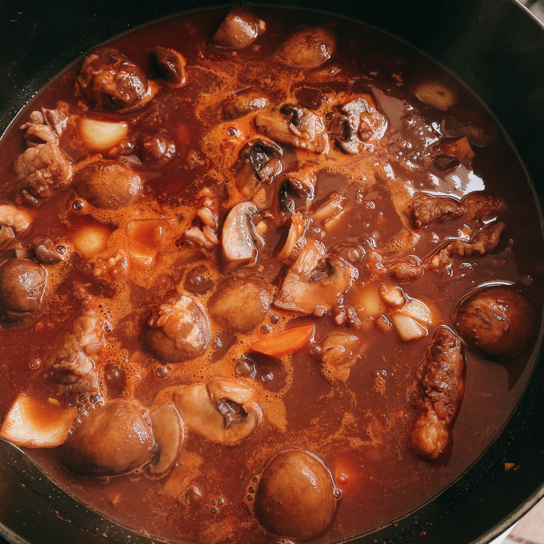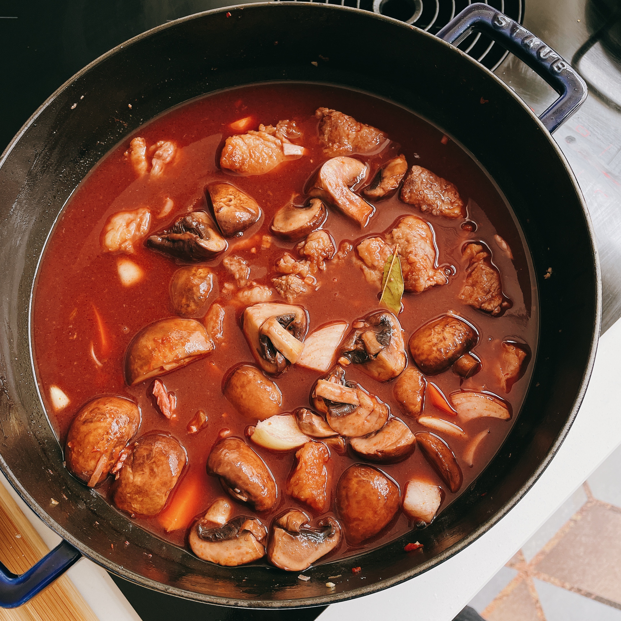 Add chopped onion (1), bay leaf (1), red wine (low tannin, 500ml), vegetable stock (300ml) and previously cooked ingredients ( mushrooms & beef cubs) into STAUB Dutch oven. Turn up the power and cook until boil, then add salt (2 tea spoon), sugar (1 table spoon), flour (1 table spoon) and blend nicely. Finally, turn down the power to low and simmer the boeuf bourguignon for 60 mins. After that, turn off the power and keep the lid on for another 20 mins to make create creamy, rich texture. And Voilà , the delicious boeuf bourguignon is done!