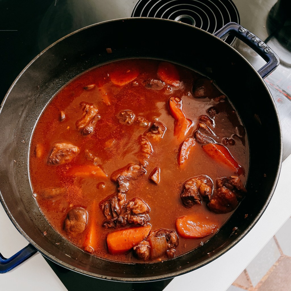 蓋鍋蓋轉小火燉煮60分鐘、熄火後蓋著鍋蓋悶煮20分鐘,絲綢滑順口感的【紅酒燉牛肉】就完成囉!