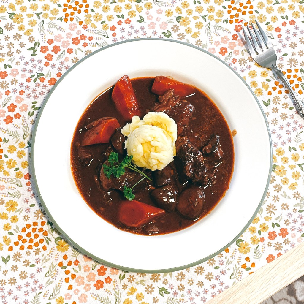 擺盤時建議先在盤子裡裝好紅酒燉牛肉,再用挖冰淇淋的杳勺挖一大球奶油薯泥放中間,最後再放裝飾用的新鮮巴西里。視覺效果滿分又無敵美味的【紅酒燉牛肉】就能華麗上桌啦!