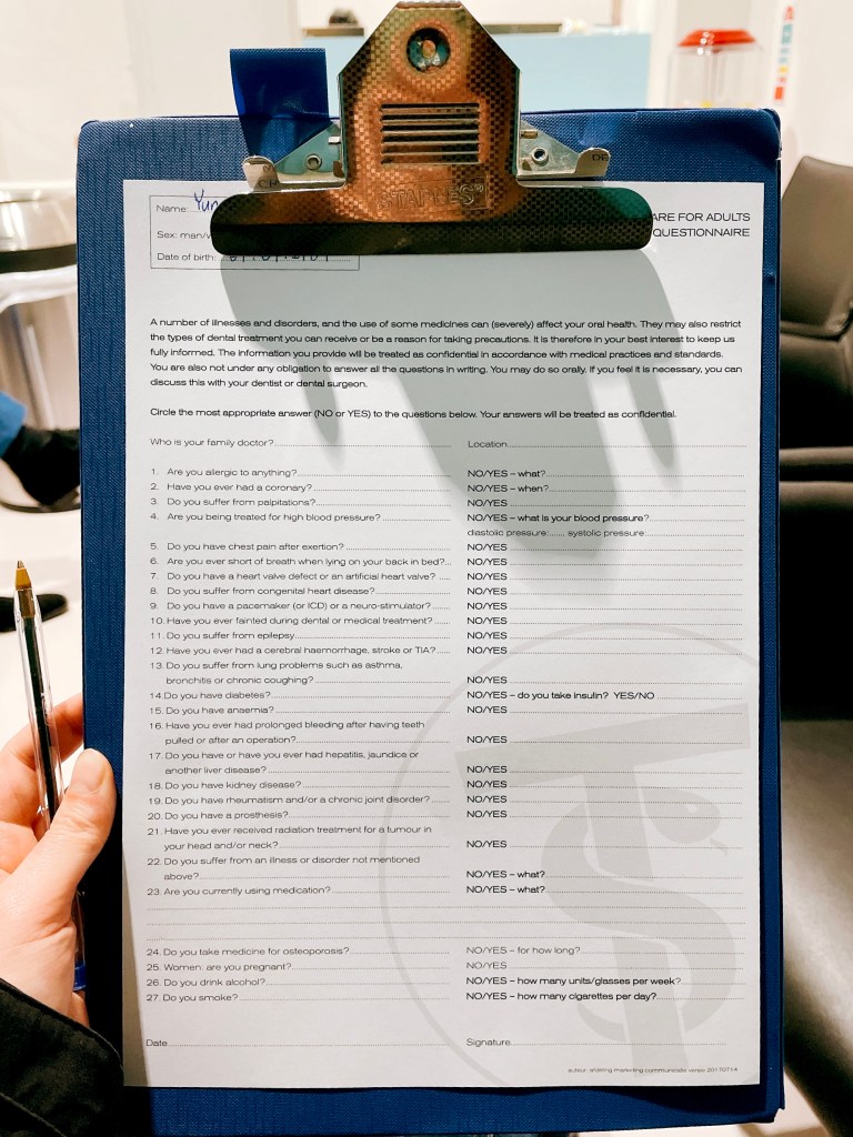 第一次到註冊的牙醫診所後,櫃檯人員會提供英文病歷問卷供填寫,問題大多是過敏、慢性病、既往症這類的確認,和在台灣初診時一樣。