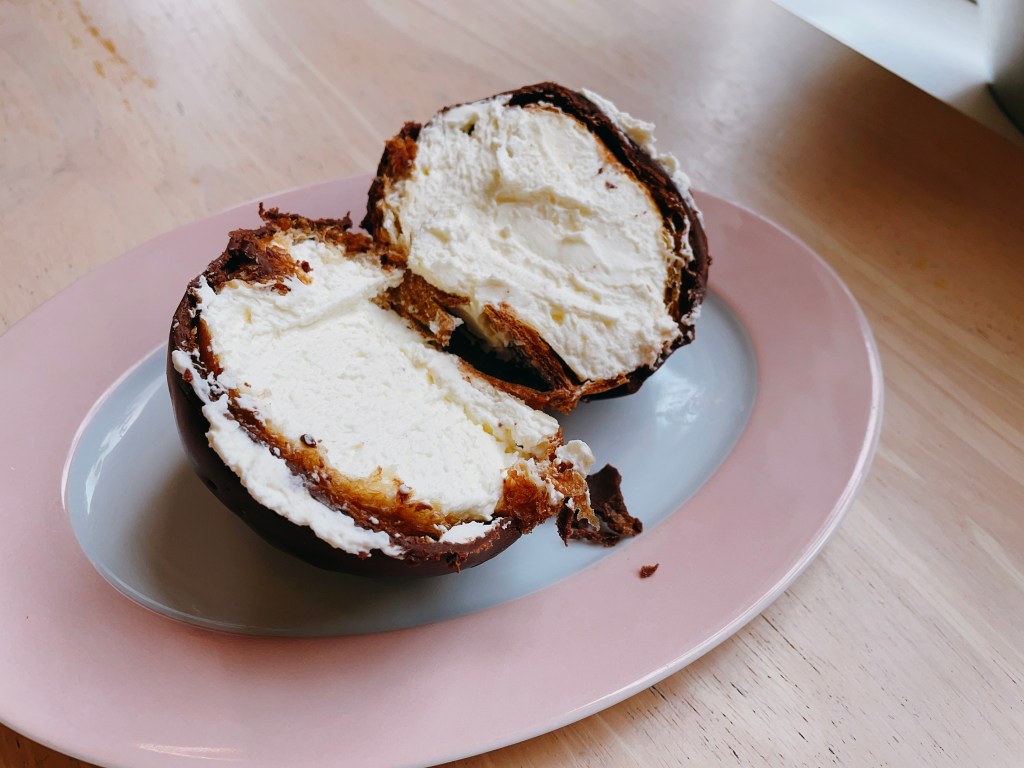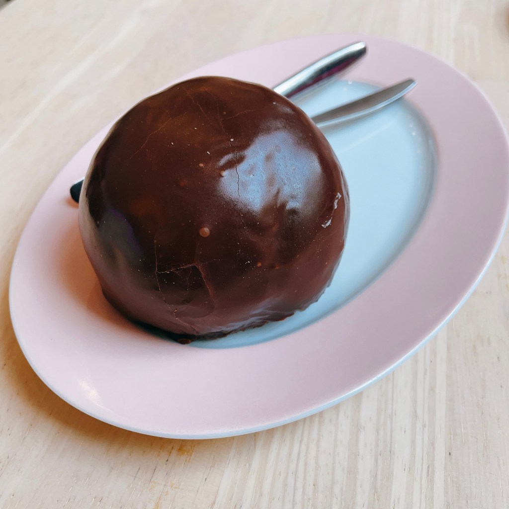 巧克力泡芙(Bossche bol)由內而外分別是鮮奶油、泡芙、巧克力,單看外型原以為巧克力外殼是脆的,沒想到切的時候整個質地意外十分柔軟。