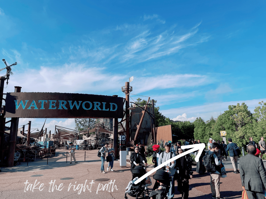 首先,入口閘門開啟後,沿著商店街直走、在好萊塢大街右轉,持續靠右邊走經過大白鯊(JAWS)、看到水世界(WATERWORLD)招牌往右邊叉路衝到底
