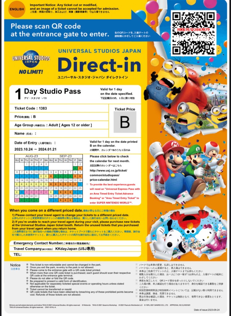 【大阪環球影城】官方授權KKday購票平台最早可2個月前線上訂票,一日券純門票(如下圖,NT1,838 /大人)建議買好機票就順手在行事曆上註記線上搶票,並記得將電子門票存在手機方便入場掃描QR code。