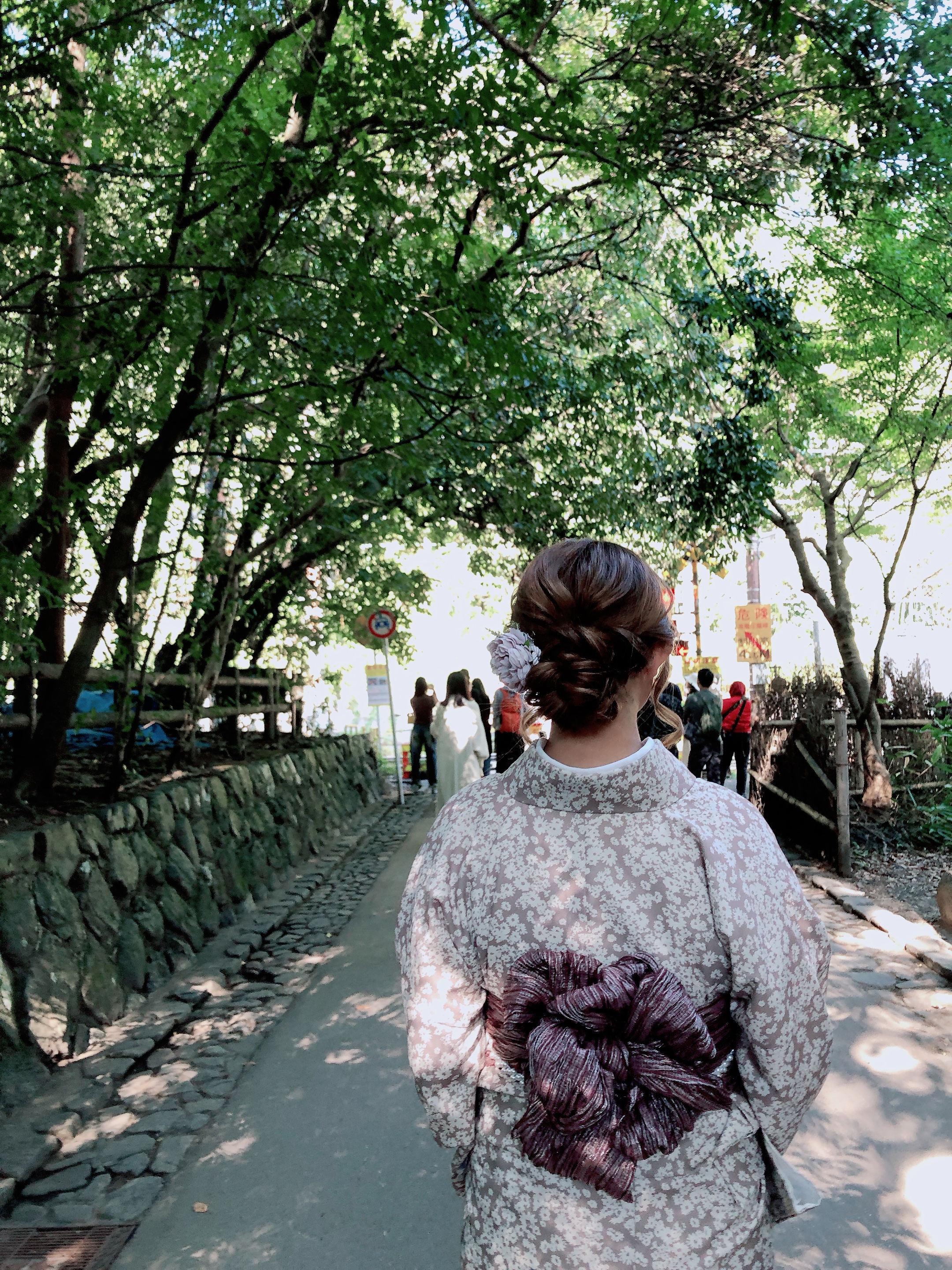 當時我猶豫很久,究竟要「在京都車站穿然後直奔伏見稻荷神社?」還是「在嵐山穿愜意在河川上划船?」評估後我還是覺得穿和服爬伏見稻荷神社實在太極限,所以就把和服留到嵐山再穿;事後回想這真是個超正確的決定!
