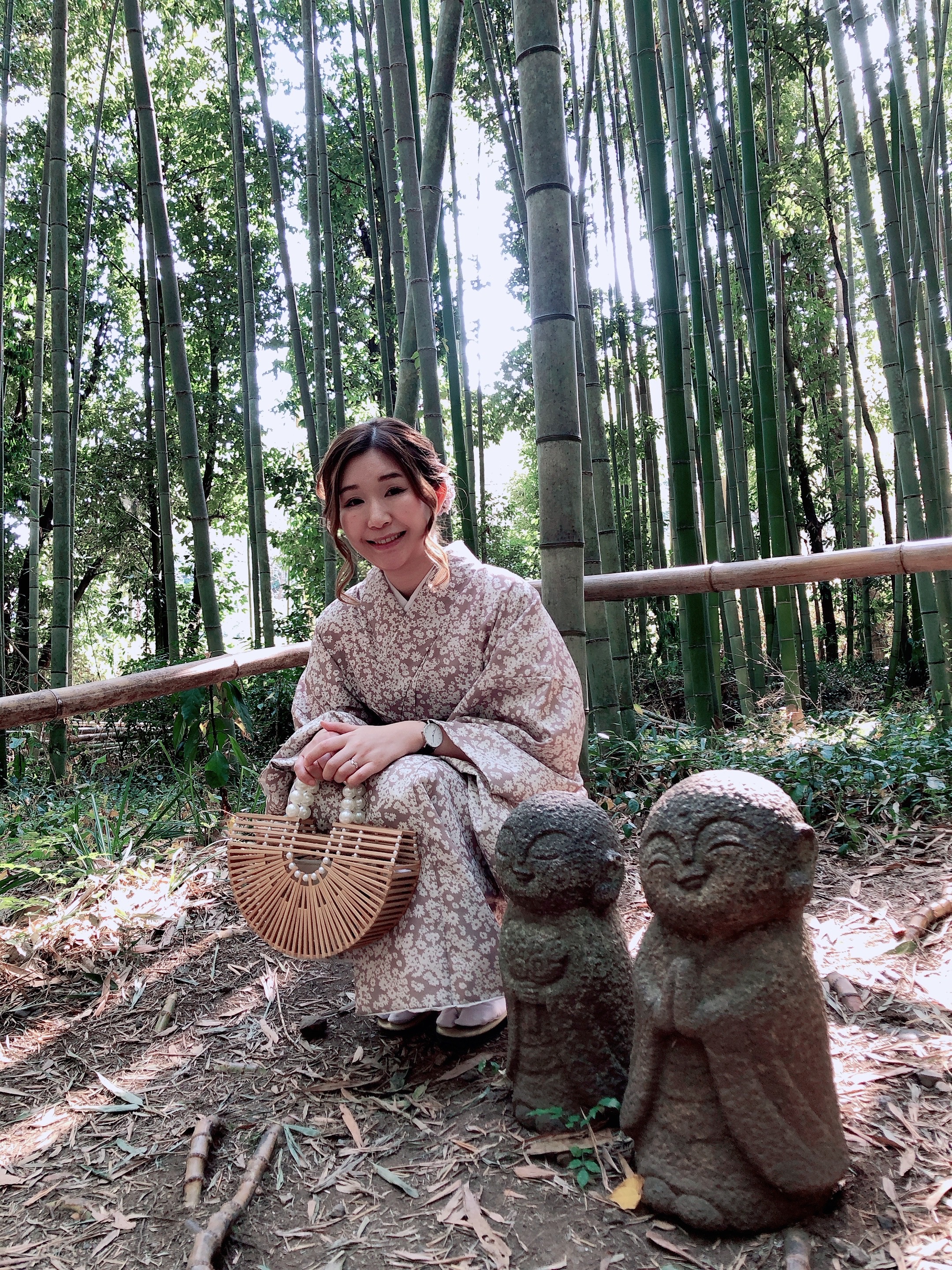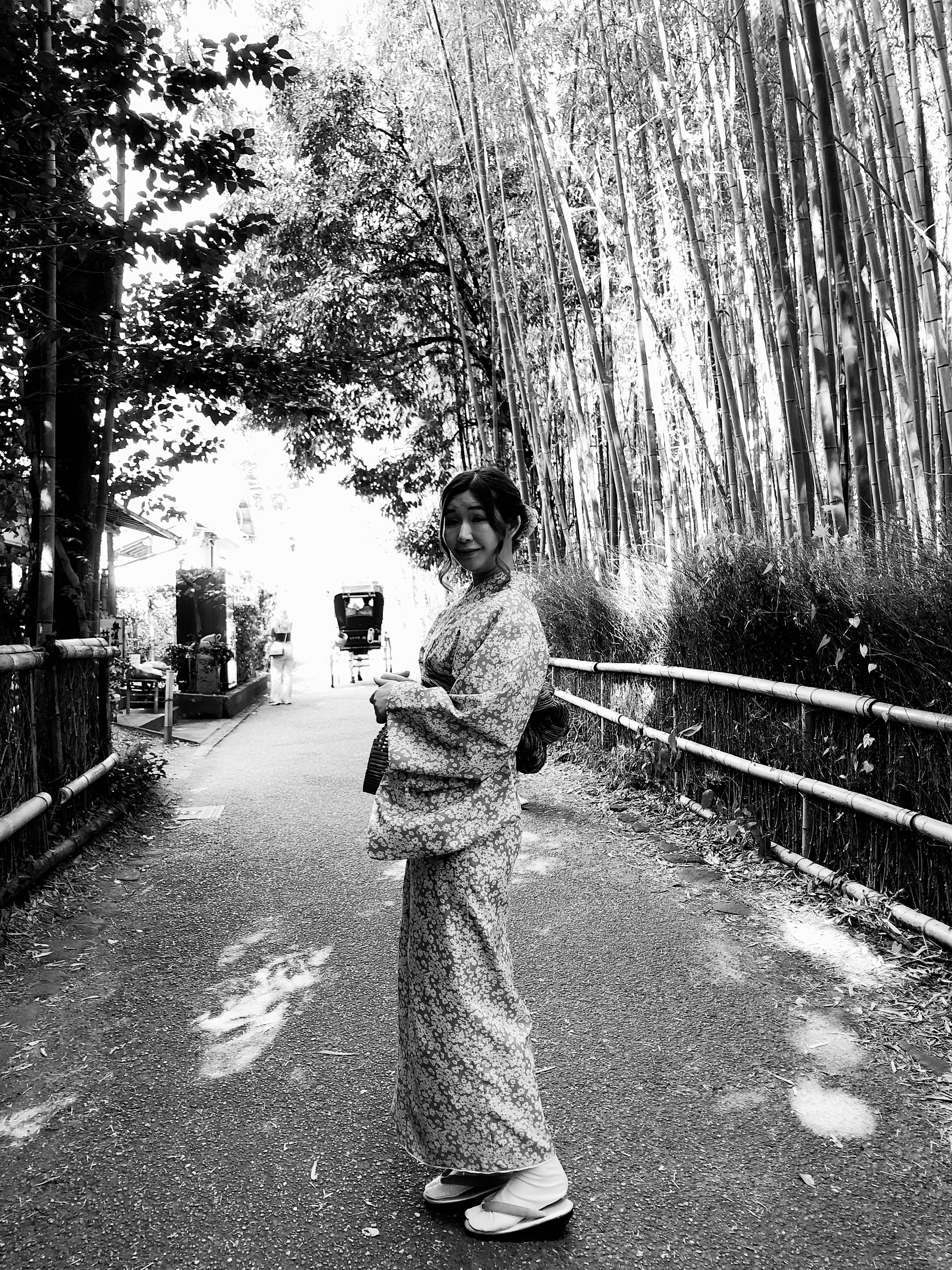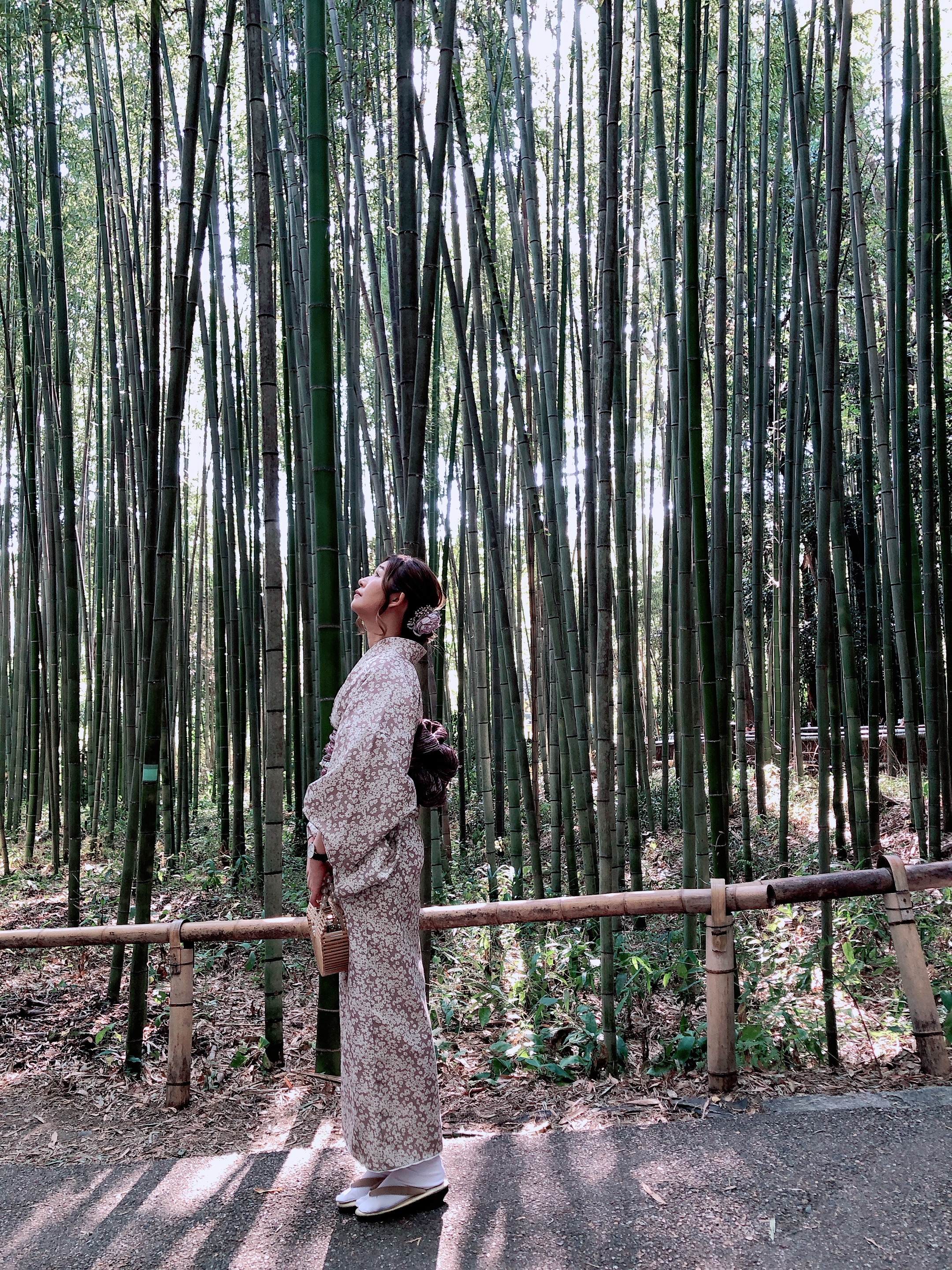 身穿和服穿梭竹林深處,我真的好喜歡陽光透過竹子灑在身上的感覺。