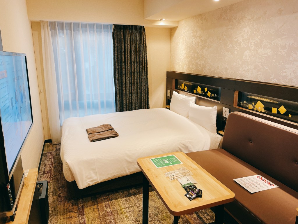 京都駛八條口【VIA Inn】標準雙人房(一大床)一晚換算台幣大概NT2,600,室內空間非常舒適寬敞,沙發茶几區可以輕鬆打開兩個大行李箱也不會堵住動線,在日本京都蛋黃區算是不可思議大空間啊!