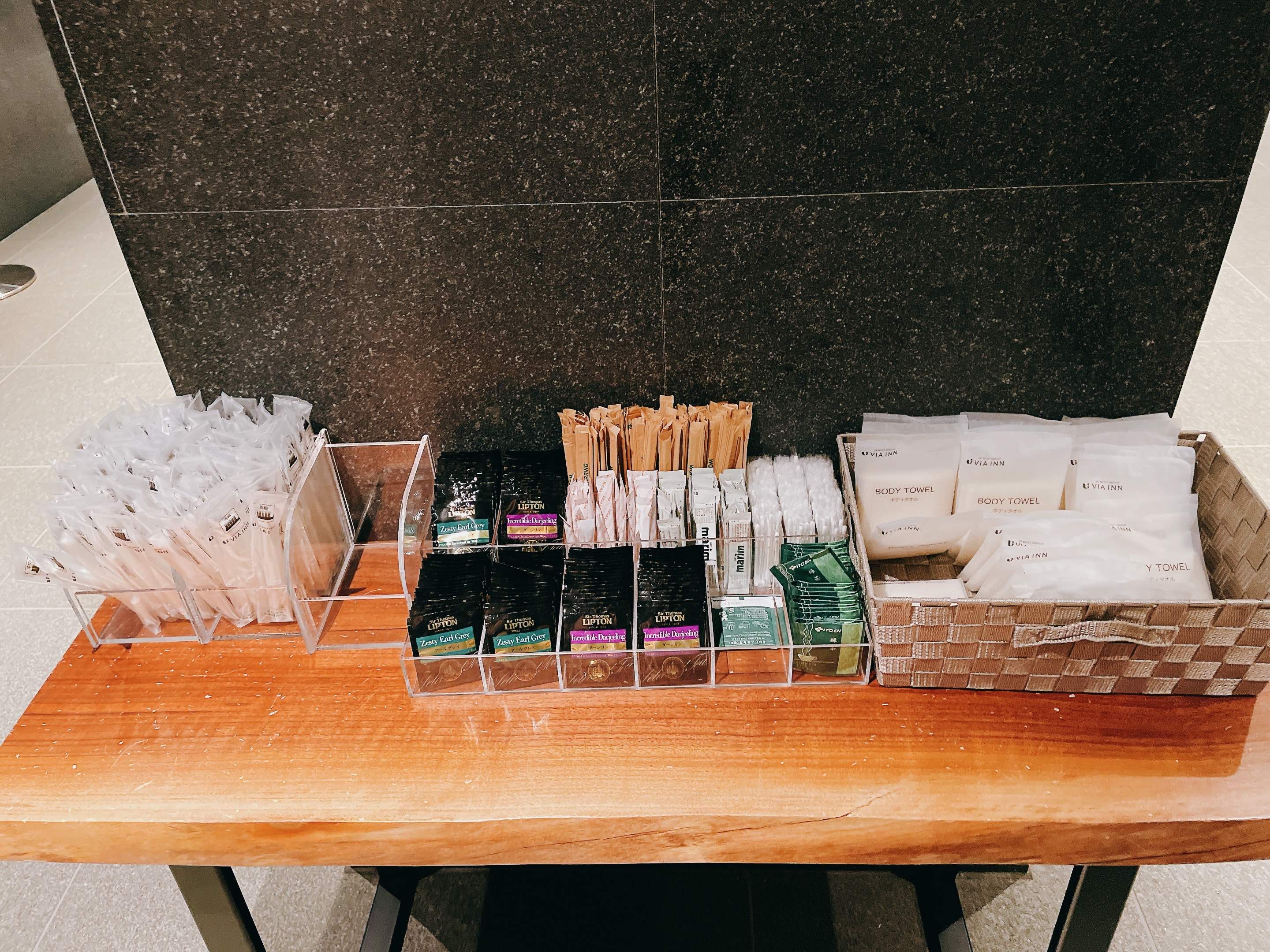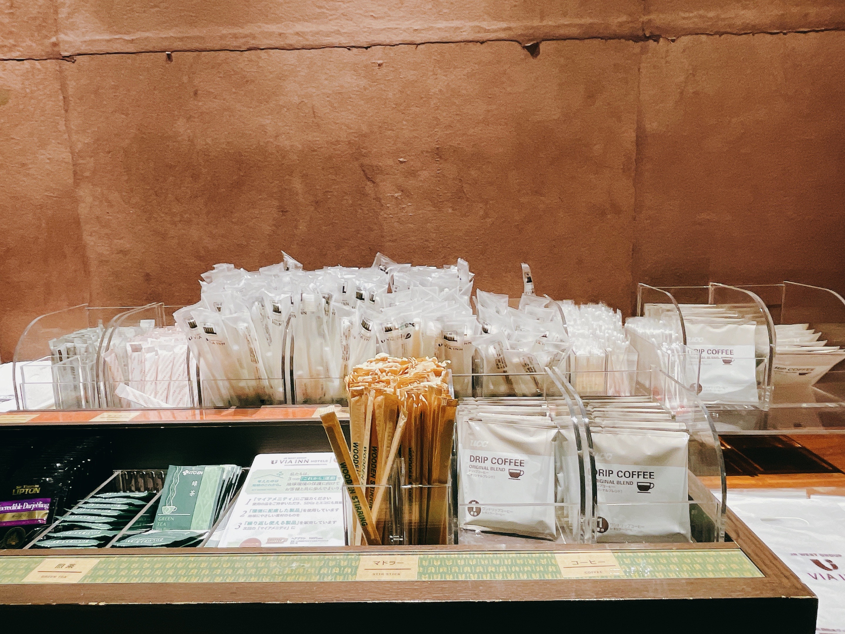 最近日本飯店/商旅為了響應永續與環保,不再於客房內預先擺放備品,而是將沐浴用品/牙膏牙刷/刮鬍刀/茶包/濾掛式咖啡等…放在一樓大廳讓客人自行取用,check-in後可依真實需求拿適量備品進房間。