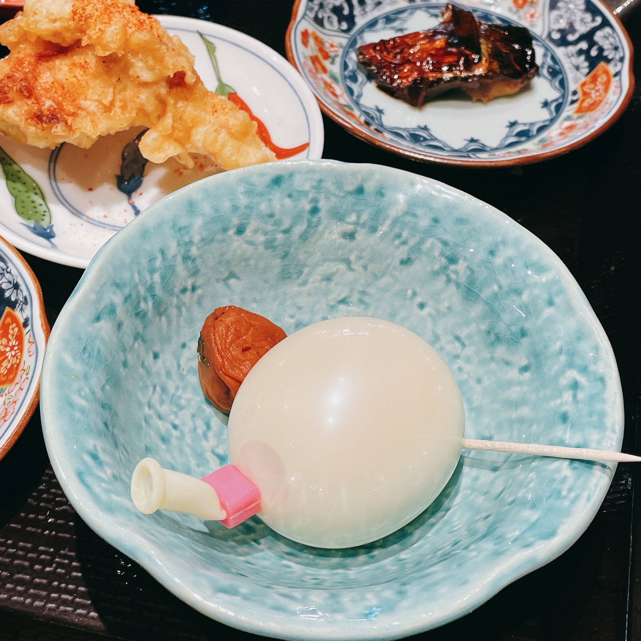 氣球豆腐並非使用市售豆腐,而是自社工房純手工製作的嫩豆腐。吃法也很有趣,將氣球豆腐放在小缽裡,用牙籤輕輕戳破氣球,軟嫩豆腐跑出來了!再澆上適量醬汁和喜歡的佐料調味,好吃又好玩的氣球豆腐真是讓人著迷。