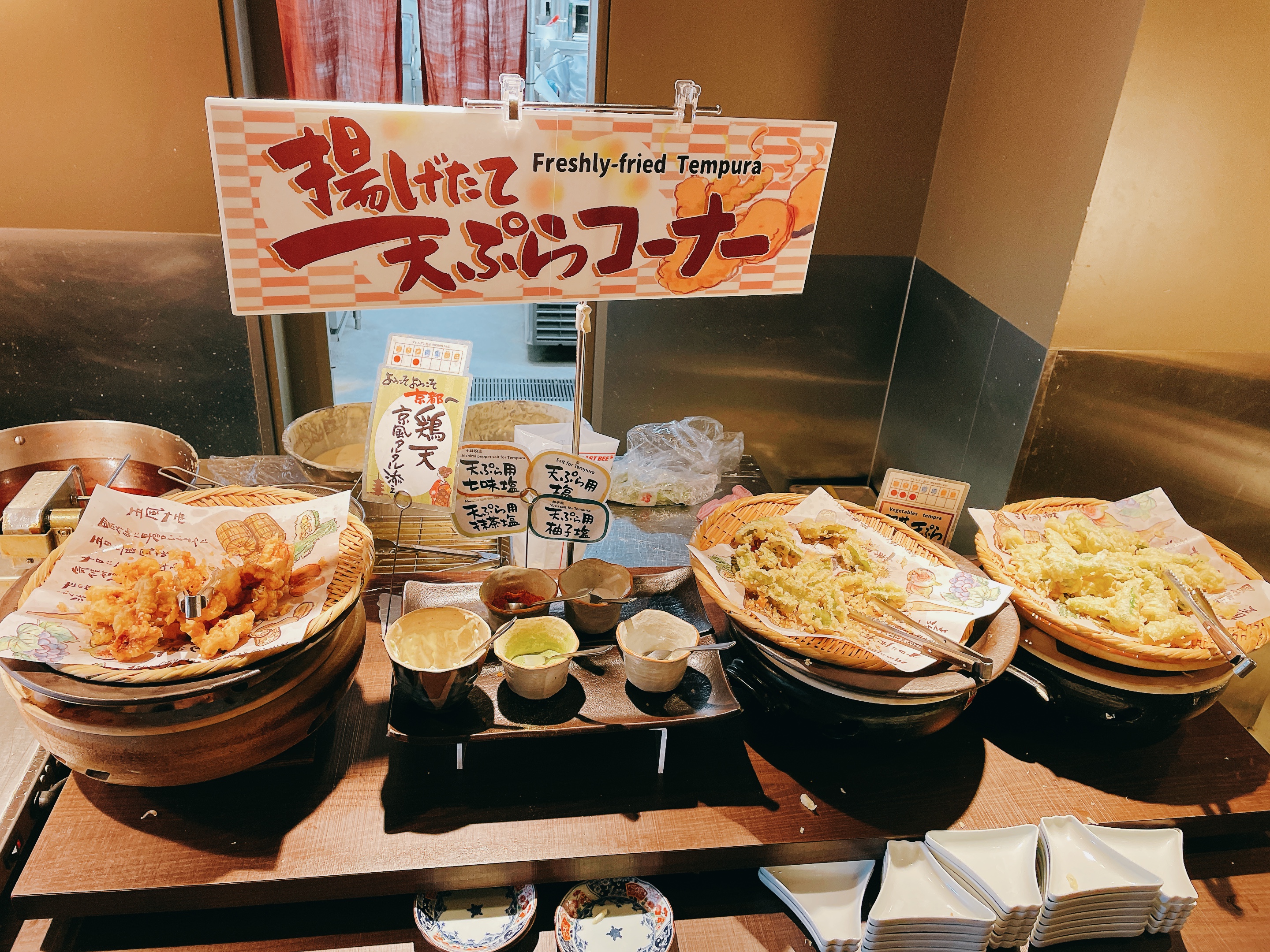 除了京都在地農家的時令蔬菜,五穀飯、京都漬物、味噌湯、藥膳咖喱、山藥泥、烏龍麵、現炸綜合時令天婦羅、牛雜鍋、筑前煮等…各種お晚菜(obanzai,京都家常菜)也讓人忍不住每種都想夾一點。