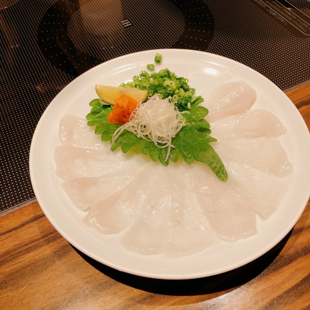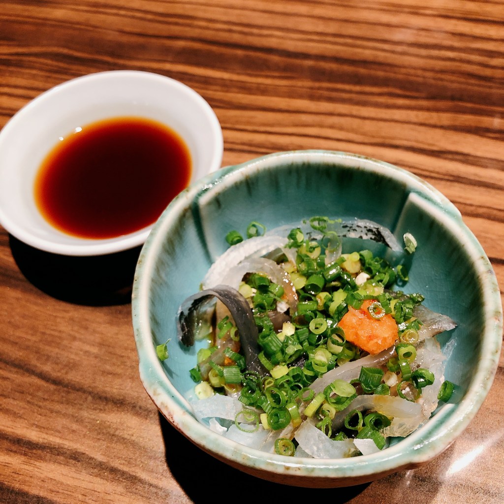 前菜涼拌河豚魚皮佐新鮮翠綠的蔥末,沾醬以柑橘酸醋調製,Q彈有嚼勁且沒有一絲腥味,成功引發食慾。