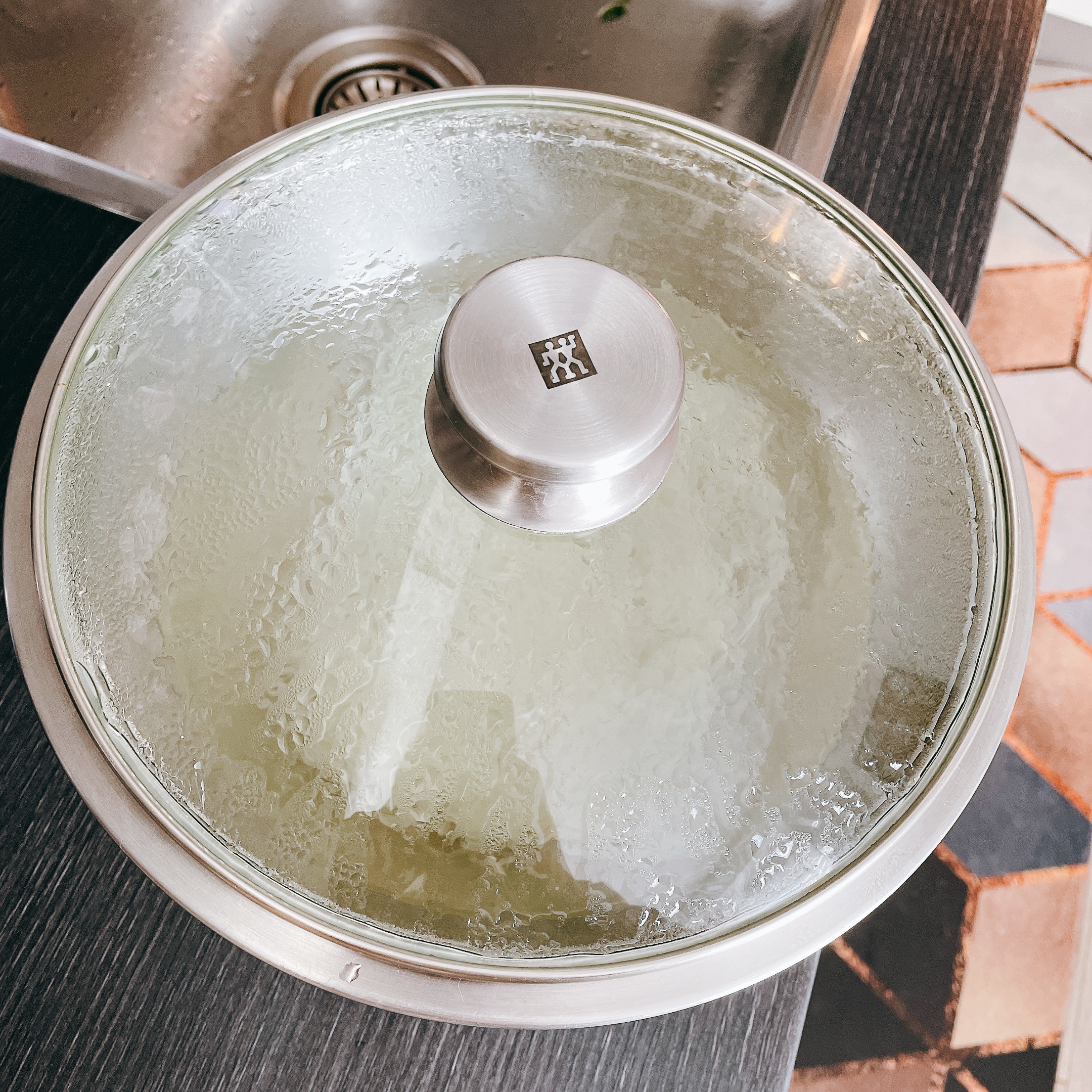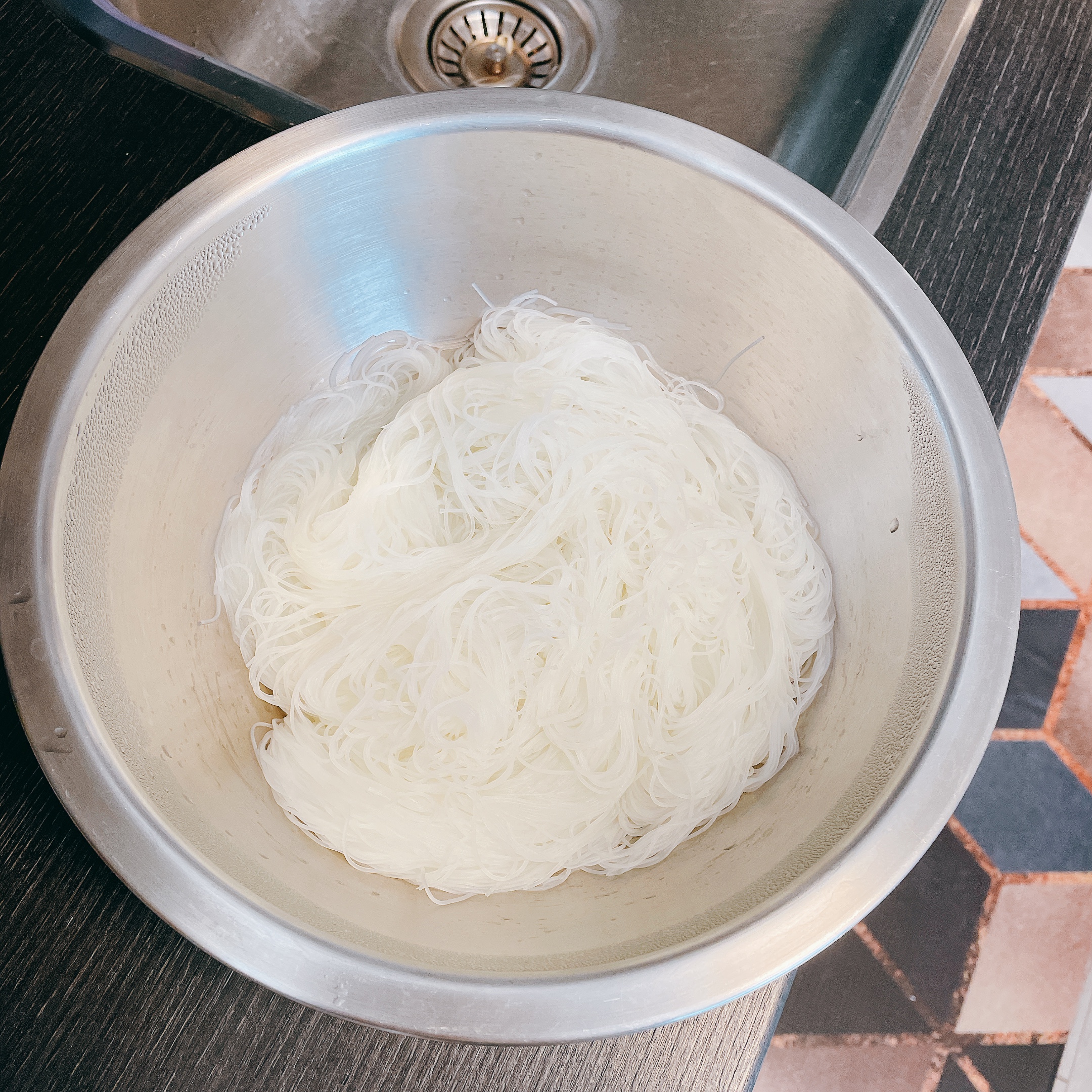 使用三川商行細米粉(300g)以滾燙熱水(1000ml)浸泡並蓋鍋蓋悶3分鐘,倒掉熱水、蓋上鍋蓋備用