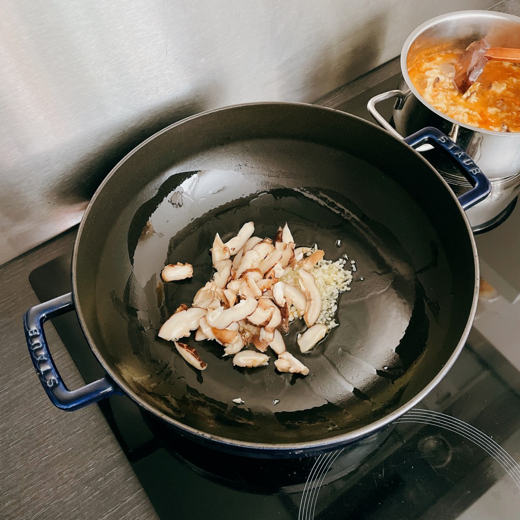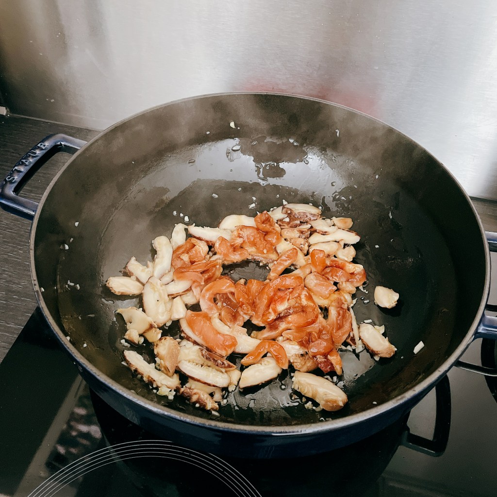 把泡開的花菇(4朵)切成細絲、蒜頭(5瓣)剁成蒜末,準備一個夠深夠大的炒鍋,以適量橄欖油熱鍋並爆香。於鍋裡加入豬里肌肉絲(100g)炒到上色,再把切成方便入口的尖頭菜(300g)、紅蘿蔔(100g)切成細絲,炒到蔬菜8分熟
