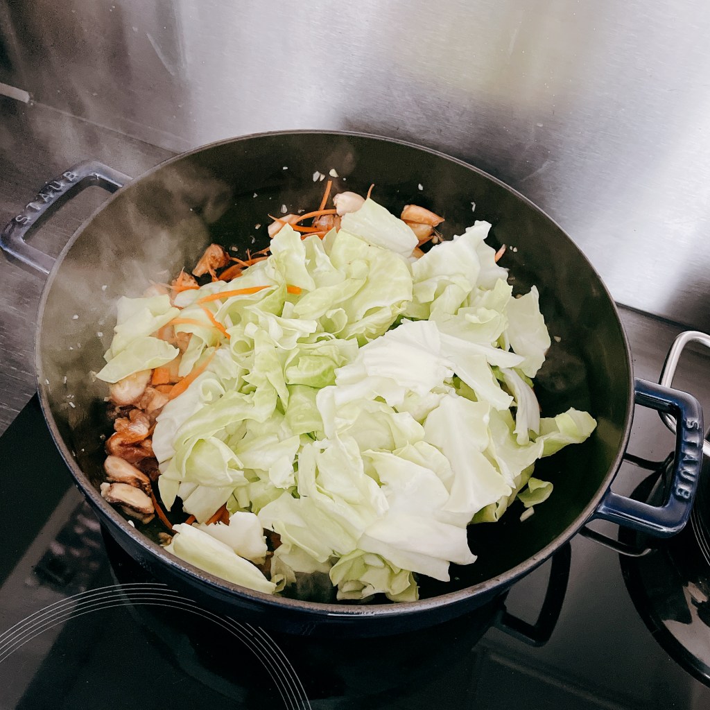 我的肉絲炒米粉食譜,基本上就是致敬爸爸的口味,以大量高麗菜、豆芽菜、香菇乾貨為主角,肉絲只是配角、取代在荷蘭取之不易的豆製素料加工品,不加也罷。